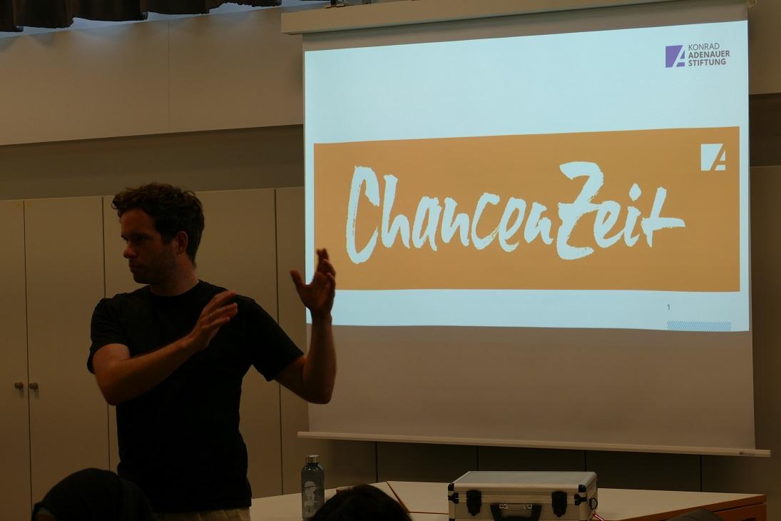 Die Schulveranstaltung begann mit einer Einführung der Tagungsleiterin Dana Alyoussef, in der sie die Konrad-Adenauer-Stiftung vorstellte und betonte, wie wichtig gesellschaftliches Engagement und politische Bildung für eine lebendige Demokratie sind. Anschließend übernahm Nils Thieben das Wort und präsentierte das Thema ChancenZeit. Dabei teilte er seine persönlichen Erfahrungen aus seiner Zeit im Zivildienst mit den Schülern, um ihnen einen praxisnahen Einblick in die Möglichkeiten und Chancen eines solchen Engagements zu geben.