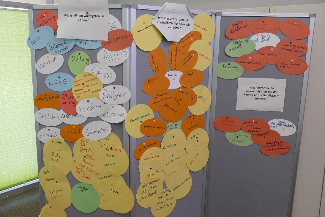 Nach der Präsentation wurden die Schüler in Tischgruppen von 6-8 Personen eingeteilt. Jede Gruppe hatte eine bestimmte Fragestellung zu behandeln, die sie in einem World-Café-Format diskutierten. Tischgruppe 1 beschäftigte sich mit der Frage: „Was ist dir am wichtigsten im Leben?“. Tischgruppe 2 erkundete die Frage: „Was brauchst du, damit ein Pflichtjahr für dich eine coole Zeit würde?“ und Tischgruppe 3 diskutierte über die Frage: „Was könnte dir die Chancenzeit bringen und was könnte sie der Gesellschaft bringen?“. Dabei kamen interessante Gedanken und Impulse auf (siehe Fotostrecke). Nach 15 Minuten wurden die Gruppen umgesetzt, um eine neue Fragestellung zu bearbeiten.