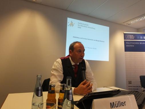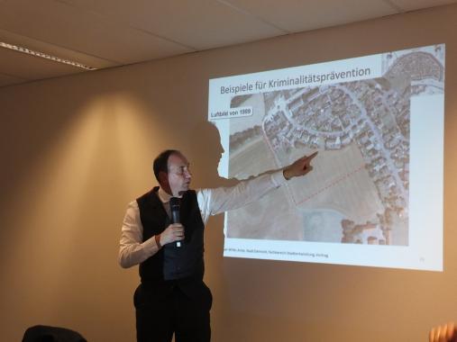 Diese Themen bildeten die Agenda von Prof. Dr. Thorsten Müller, der selbst in der Polizeiausbildung tätig ist und sich zudem, durch seine beruflichen Stationen in Bremen, gut in der Stadt auskennt. Müller stellte die These auf, dass Städtebau einen Beitrag zur Sicherheit und somit zur Lebensqualität einer Stadt leisten kann. Hierfür müsse Sicherheit als Querschnittsaufgabe zwischen Politik, Polizei und Eigentümern verankert werden. Dabei betonte Müller, dass Sicherheit nicht nur Aufgabe der Polizei sei. Alle Akteure müssten Dialog- und Kompromissfähigkeit zeigen und gemeinsam Sicherheitsaspekte im Städtebau berücksichtigen. Sogenannte Angsträume, von denen Müller dem Publikum einige Fotobeispiele aus Bremen zeigte, könnten bereits in der Stadtplanung vermieden werden. „Man muss da nicht immer einen Polizisten platzieren“, wenn man in Problemzonen diverse Maßnahmen ergreifen könnte, die das Sicherheitsgefühl der Bürgerinnen und Bürger erhöhen würden. Angsträume, wie Sichtbehinderungen durch dunkle Straßen mit hohen Mauern oder dunkle, schmale Hauseingänge, könnten beispielsweise durch hellere Laternen, Pflege von Grünflächen sowie eine Glasfront anstelle eines „schwarzen Lochs“ vor Hauseingängen, beseitigt werden. Beim Neubau müssten Sicherheitsaspekte und Kriminalprävention bereits in der Planung berücksichtigt werden, damit Angsträume gar nicht erst entstehen.