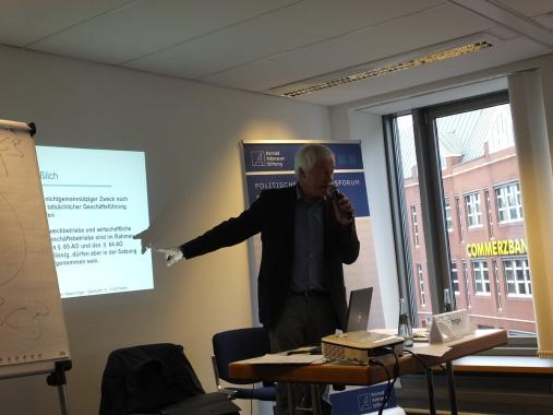Im ersten Teil der Veranstaltung ging es um den Verein als Rechtsform. Finger, der selbst über viele praktische Erfahrungen im Vereinsmanagement verfügt, ging dabei auf die Voraussetzungen für die Gründung eines Vereins und die Kriterien der Gemeinnützigkeit ein. Außerdem wurden Aufgaben des Vereinsvorstandes und Befugnisse der Vereinsmitglieder diskutiert.