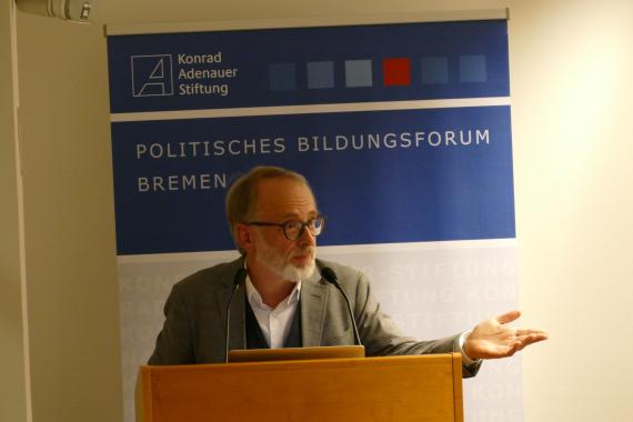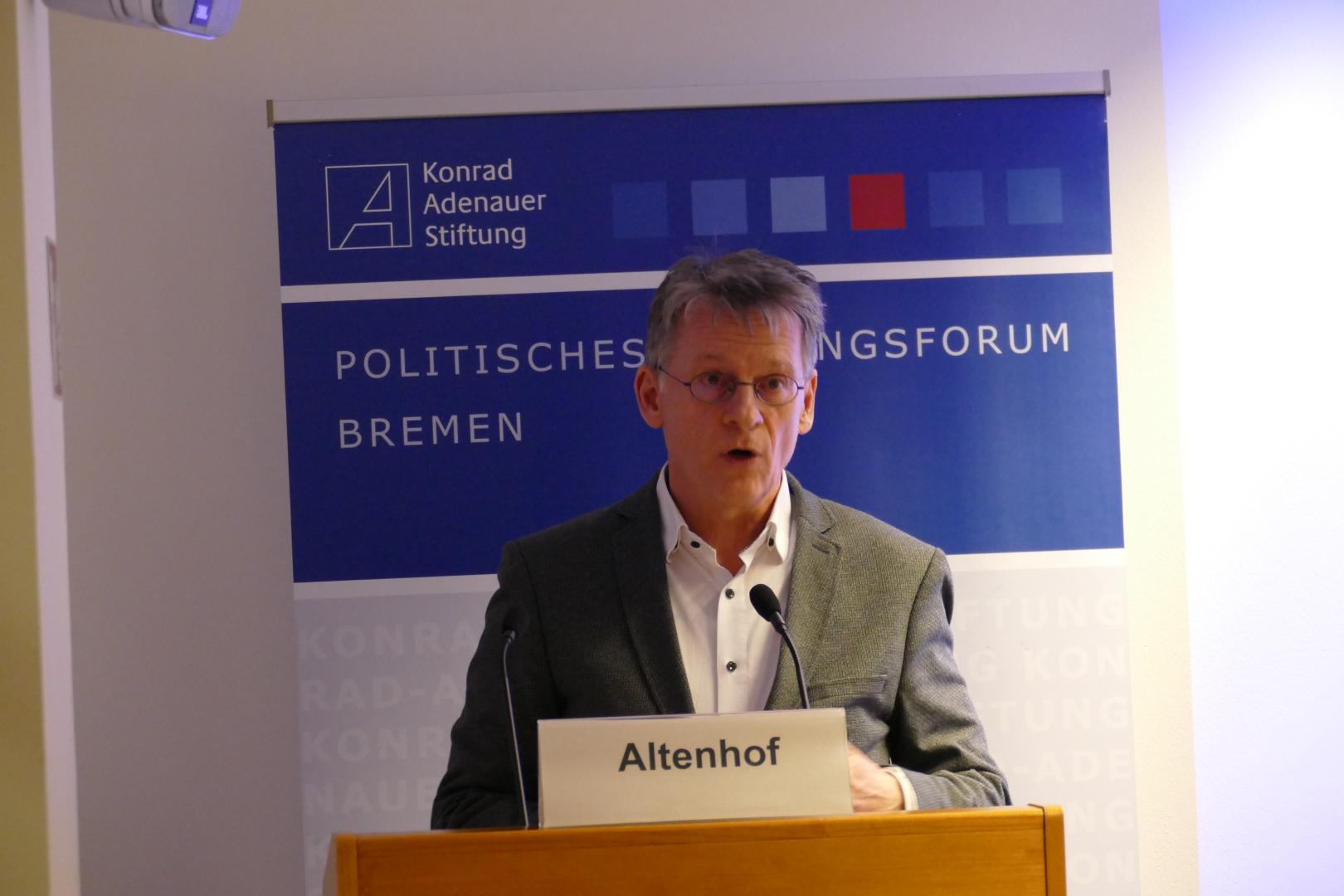Altenhof, Leiter der KAS Bremen, stellte Schröm vor und führte thematisch in die Veranstaltung ein. Er betonte, dass es sich beim Cum-Ex-Skandal um nichts geringeres als den größten Steuerdiebstahl der Nachkriegszeit handle. Dabei ginge es nicht nur um den Fall Scholz, sondern insbesondere um die Folgen für die politische Kultur in Deutschland.