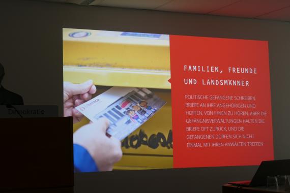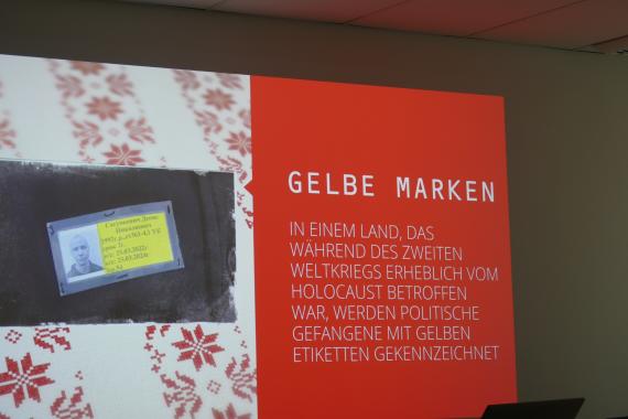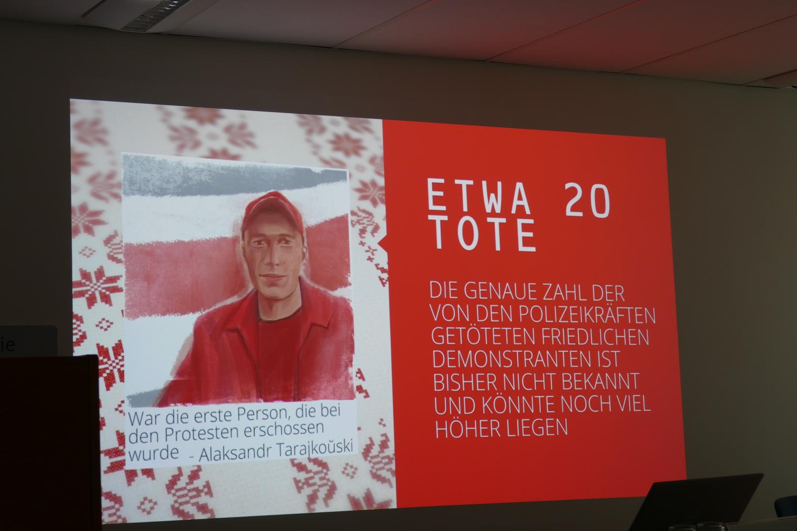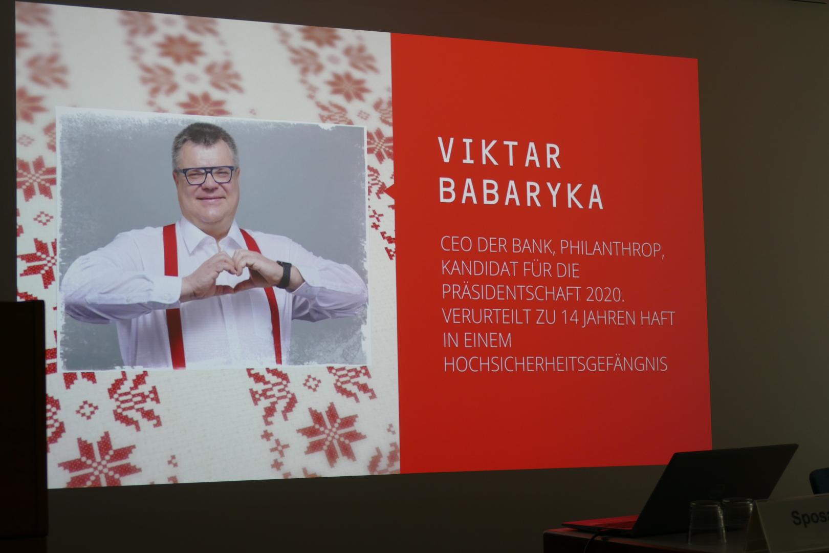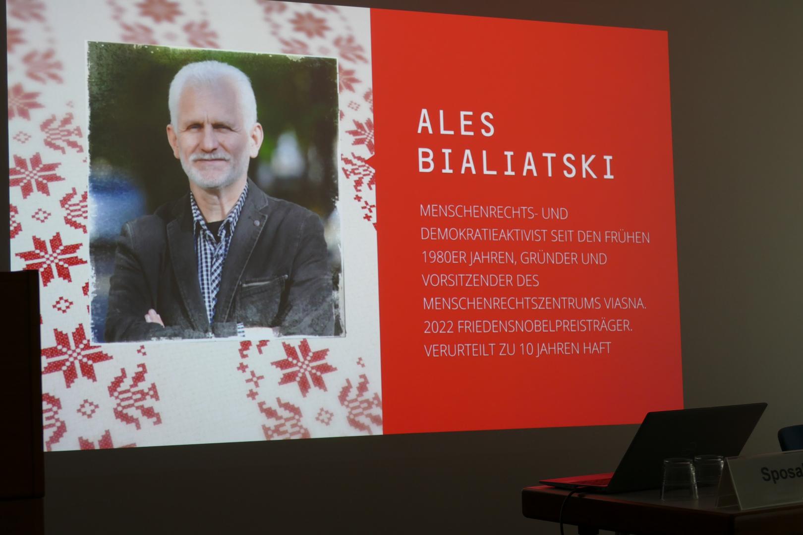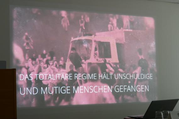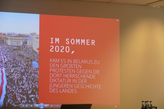 Altenhof übergab das Wort an den Schauspieler Tim Lee, der aus dem Buch „Zekamerone“ las, in dem Texte politischer Gefangener versammelt sind. Darauffolgend zeigte Razam ein Video über die Situation in Belarus, in dem noch einmal die politische Verfolgung und der menschenrechtswidrige Umgang mit politischen Gegnern thematisiert wurde: Gewaltsam wurden die Proteste 2020 niedergeschlagen, und Menschen, die ihre Meinung geäußert und/oder sich für Freiheit eingesetzt haben, wurden zu drakonischen Strafen, meist weit über 10 Jahre, verurteilt. In den Gefängnissen werden die politisch Gefangenen dann misshandelt, in Einzelhaft gesperrt und ein Kontakt mit der Außenwelt wird ihnen vorenthalten. Insgesamt, erklärte Razam, gibt es 1500 offiziell anerkannte politische Gefangene in Belarus, geschätzt werden jedoch um die 5000. Viele scheuen ein Anerkennungsverfahren, weil die Angehörigen Angst haben vor weiteren Repressionen. Jene die das Gefängnis wieder verlassen konnten, haben mit starken Ängsten und posttraumatischen Belastungsstörungen zu kämpfen, berichtete Razam.