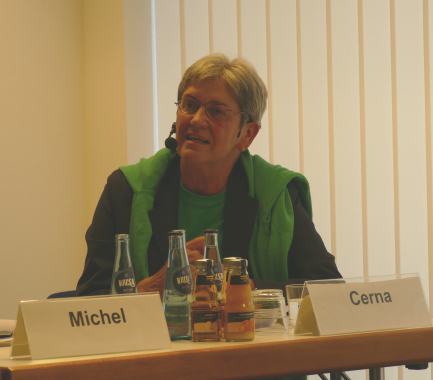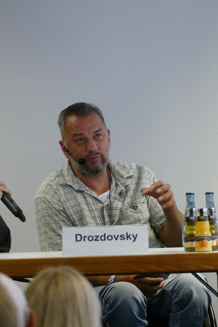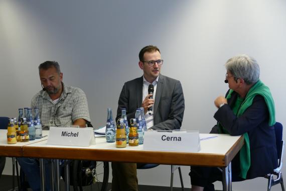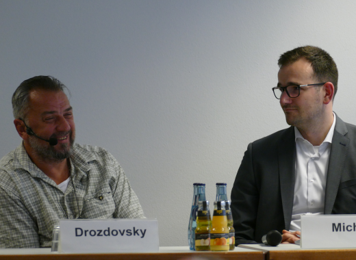 Im zweiten Teil gab es eine von der Journalistin Libuse Cerna moderierte Diskussionsrunde mit Michel und Sergej Drozdovsky, über Belarus. Drozdovsky ist studierter Jurist und setzt sich für Menschen mit Behinderung ein, er selber ist Rollstuhlfahrer. 2021 wurde er vom Regime unter Hausarrest gestellt, ohne Gerichtsverfahren und wegen angeblicher Korruption. Er schaffte es jedoch, das Land zu verlassen und lebt jetzt als anerkannter politischer Verfolgter des belarusischen Regimes in Deutschland. In der Diskussion wurden Möglichkeiten aufgezeigt, um Unterstützung für politisch Gefangene zu zeigen, als Beispiel, in dem Briefe an die zuständigen Ministerien geschickt werden, die unterschriebene Petitionen beinhalten. Razam hat während der Veranstaltung auch eine solche Petition für Maria Kalesnikava ausgelegt. Es sei wichtig, das Schicksal der politisch Gefangenen im Bewusstsein zu haben, erklärte Drozdovsky. Laut Michel sei das Regime von Belarus sehr verbunden mit dem Regime in Russland. Ein Untergang dieses bedeute auch zeitgleich den Untergang des Regimes von Belarus. Deshalb sei es auch wichtig, die Ukraine weiter zu unterstützen, damit sie sich gegen das russische Regime durchsetze. Auch das Publikum konnte sich einbringen. Der Grund, warum Drozdovsky von dem Regime unter Hausarrest gestellt und politisch verfolgt wurde, war Gegenstand einer Frage. Eine andere Frage von einem Besucher wies noch einmal auf die Verflechtung zwischen den Situationen in Russland, Belarus und der Ukraine hin.