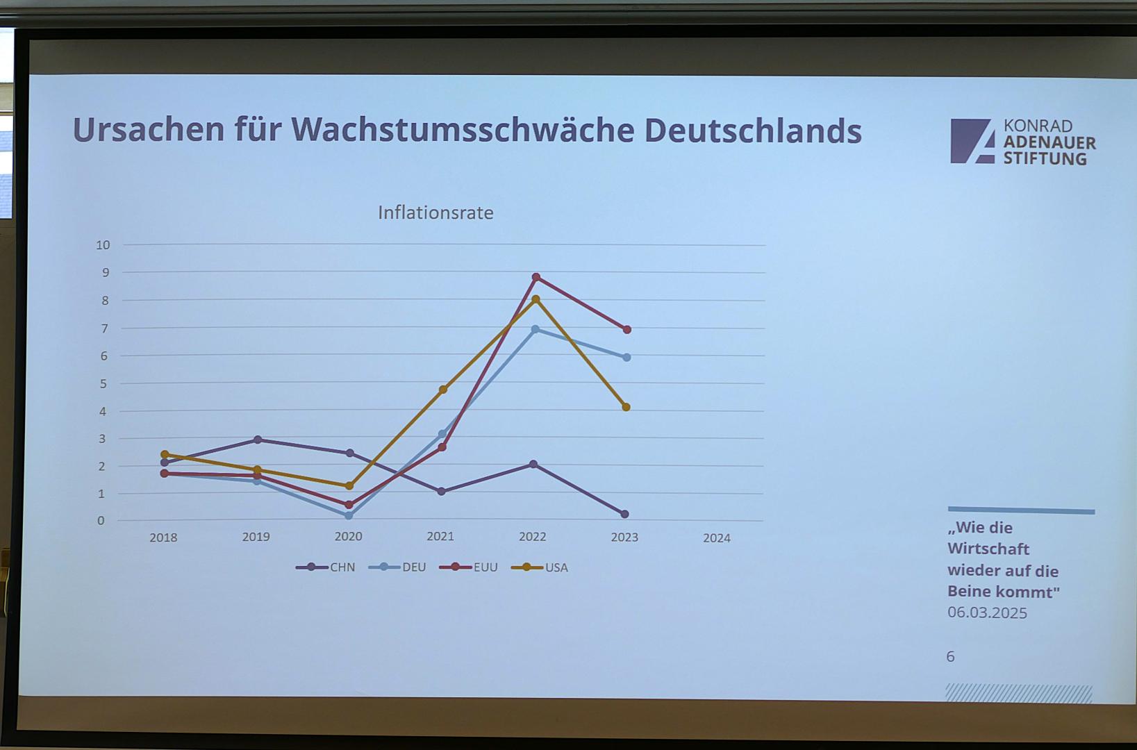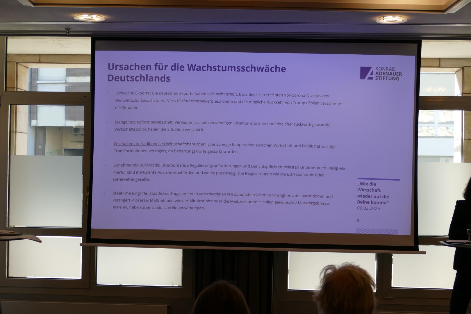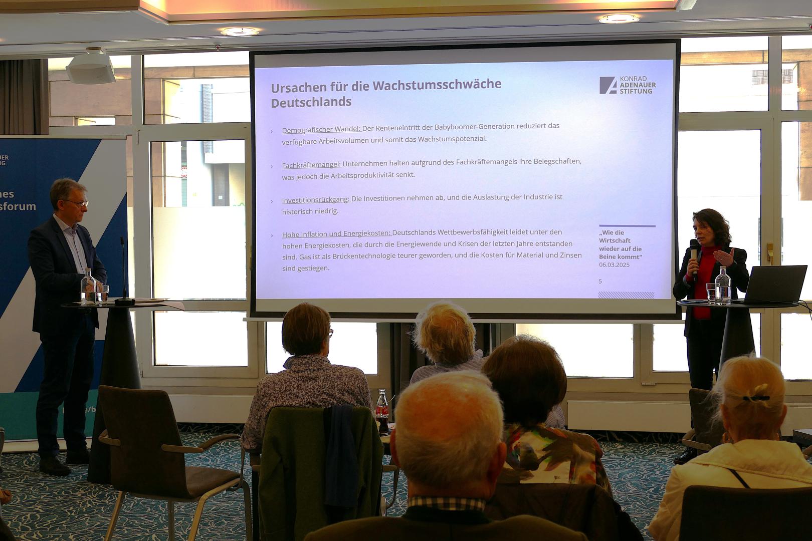 Die deutsche Wirtschaft ist seit 2023 in der Rezession. Etwa drei Millionen Arbeitslose, eine besorgniserregende Bürokratie, der demografische Wandel und vieles mehr machen ihr stark zu schaffen. Vor diesem Hintergrund begrüßte Ralf Altenhof das Publikum und stellte Dr. Sarah Al Doyaili-Wangler aus der Abteilung Analyse und Beratung der Konrad-Adenauer-Stiftung vor.