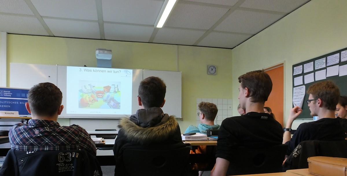 Ralf Knoche klärte dann in der Einführung seines Vortrages zunächst den Irrtum auf, dass das Trinkwasser in Bremerhaven nicht aus der Weser oder der Nordsee kommt, sondern aus Grundwasserquellen im Bremer Umland stammt. Der tägliche Wasserverbrauch von ca. 120 Litern pro Person ließ die Schülerinnen und Schüler aufhorchen und Knoche merkte an, dass das Wasser aus der Leitung auf Grund der EU-Trinkwasserrichtlinien grundsätzlich trinkbar sei und in Deutschland als bestüberwachtes Lebensmittel gelte.