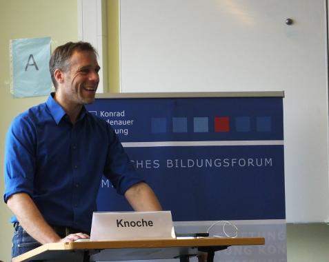 Der Fokus des zweiten Teils seines Vortrages lag im internationalen Kontext. Hierbei betonte Knoche, dass nach Angaben der Weltgesundheitsorganisation (WHO) 600 Millionen Menschen keinen Zugang zu Trinkwasser haben, 1,8 Milliarden Menschen täglich verkeimtes Wasser zu sich nehmen und rund 2,4 Milliarden Menschen weltweit keinen Zugang zu Sanitäranlagen haben. Diesen prekären Umständen soll u.a. mit Hilfe des Rechts auf Wasser und Hygiene aus dem Jahr 2010 und mit den Sustainable Development Goals aus dem Jahr 2015 entgegen gewirkt werden. Als Mindestziel nannte Knoche die Verfügbarkeit von täglich 20 Liter sauberem Wasser pro Person und einen nicht längeren als einen Kilometer langen Weg zum naheliegendsten Wasserbrunnen.