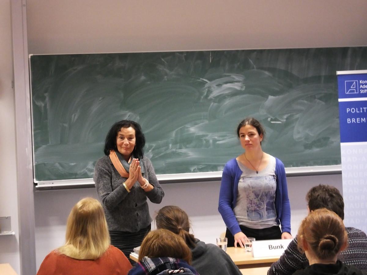 Ein Zeitzeugengespräch mit Angelika Cholewa am Gymnasium Horn, moderiert von Sarah Bunk, wissenschaftliche Mitarbeiterin der Konrad-Adenauer-Stiftung Bremen, eröffnete am 29. November 2016 die Ausstellung „DDR-Stasi – Spitzel von nebenan“ der KAS. Im Dialog mit den Schülerinnen und Schülern schilderte Frau Cholewa ihre Erfahrungen in der Deutschen Demokratischen Republik (DDR), nachdem sie sich der Zusammenarbeit mit der Staatssicherheit (Stasi) verweigert hatte.