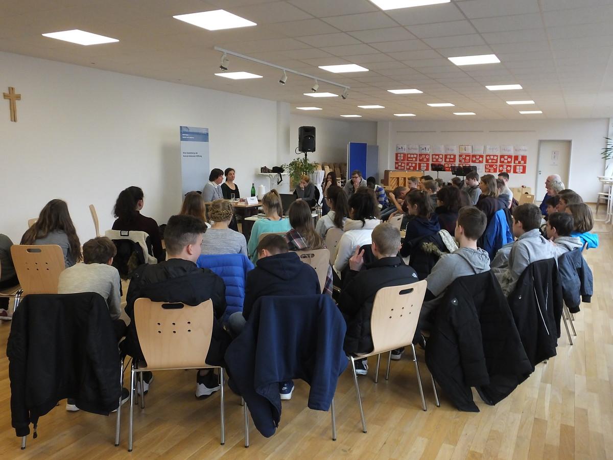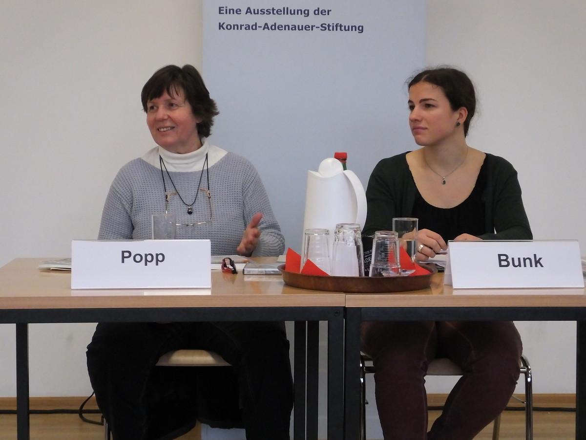 Im Dialog mit den Schülerinnen und Schülern schilderte Sabine Popp ihre Erfahrungen in der Deutschen Demokratischen Republik (DDR) und ihren Protest gegen die Umstände in der SED-Diktatur durch Graffitis wie „Wiedervereinigung“ als 17-Jährige, was nach dem Verrat durch einen Inoffiziellen Mitarbeiter (IM) an die Stasi zu ihrer Verhaftung und einer Verurteilung zu fünf Jahren Gefängnis führte.