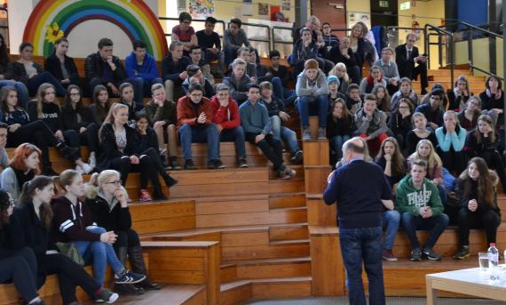 Als Einstieg in seinen Vortrag ging Rainer Eppelmann auf die Zugehörigkeit zum SED-Regime und die damit einhergehenden Bildungschancen für junge Erwachsene ein. Die Erzählungen aus seinem eigenen Leben verdeutlichten, dass die Zugehörigkeit zum Sozialistischen System entscheidend für den weiteren Bildungsweg war. So berichtete Herr Eppelmann, dass ihm die Möglichkeit auf ein Studium verwehrt wurde, da er kein Mitglied der Freien Deutschen Jugend (FDJ) gewesen sei. Mithilfe dieses Rückblickes verdeutlichte er den Schülern die Vorteile der demokratischen Grundordnung, in der sie aktuell leben.