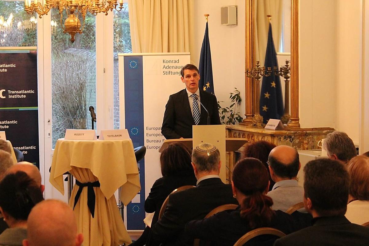 Das Panel setzte sich aus dem Europaparlamentarier Heinz K. Becker, Dr. Robert Rozett, Direktor des Dokumentationszentrums Yad Vashem sowie Katharina von Schnurbein, Kommissarin gegen Antisemitismus und Viviane Teite-baum, Abgeordnete des Brüsseler Parlaments zusammen. Moderiert wurde die Diskussionsrunde von Herrn Daniel Schwammenthal, dem Direktor des Transatlantischen Instituts AJC in Brüssel.