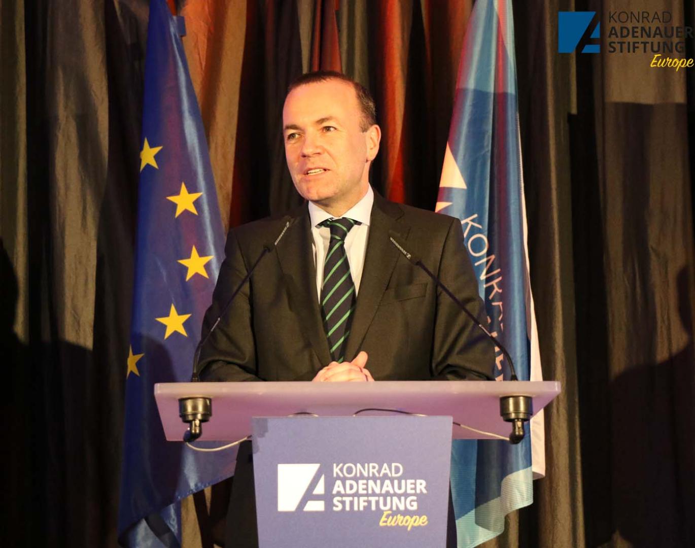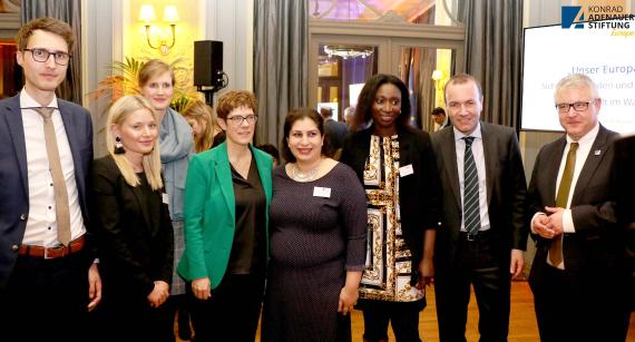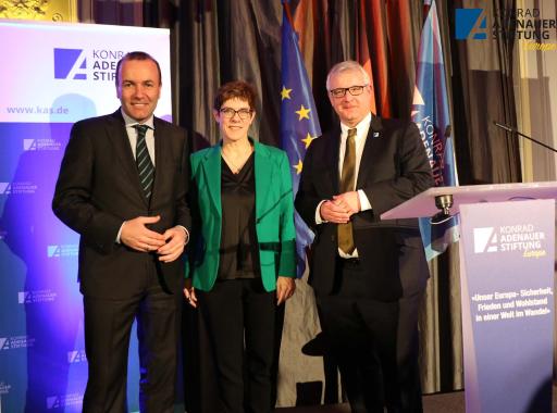 Von Mut und Ambitionen für Europa sprach auch die Vorsitzende der CDU, für die Europa primär ein Friedensprojekt ist. Kramp-Karrenbauer appellierte an das internationale Publikum im Saal, sich besonders heutzutage vom Mut der Väter Europas leiten zu lassen, offene Auseinandersetzungen zu führen und eine Vision für ein besseres Europa zu entwickeln. Einer dieser Väter, auf den die gebürtige Saarländerin mehrmals zu sprechen kam, ist der französische Politiker Robert Schuman: „Er hat verstanden, dass Europa nicht das eine große Projekt ist, sondern dass es viele kleine, tatkräftige Schritte braucht“. Schuman ist jedoch nicht der einzige, der entscheidende Schritte bei der Errichtung eines gemeinsamen Fundaments für Europa initiiert hat. Kramp-Karrenbauer bezog sich ebenfalls auf die mutigen Frauen und Männer, die bereits vor 100 Jahren nach dem Ende des ersten Weltkrieges an der Weimarer Verfassung und somit an der Grundlage unserer Demokratie arbeiteten. Ebenso war die Einführung des Grundgesetztes vor 70 Jahren, nach der Austragung des Zweites Weltkrieges, gleichermaßen bedeutend für die Zukunft der Demokratie Deutschlands und somit für die Aussöhnung Europas. Den Fall der Berliner Mauer vor 30 Jahren, ein weiteres Jubiläum in diesem Jahr, nannte Kramp-Karrenbauer als drittes Beispiel für mutiges und unerschrockenes Vorgehen unserer Vorfahren, die im Sinne der Demokratie und der Zusammengehörigkeit Europas handelten. Dass es die Menschen Europas sind, die auch heute noch und gerade im Vorfeld zu den Europawahlen im Vordergrund stehen sollten, unterstrich auch Weber: „Europa hat nur eine Zukunft, wenn wir es den Menschen zurückgeben, die entscheiden, in welche Richtung der Kontinent geht“.