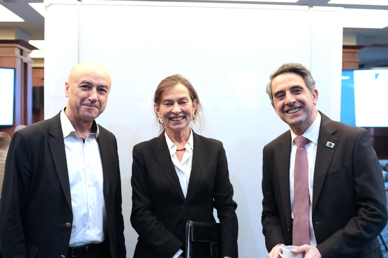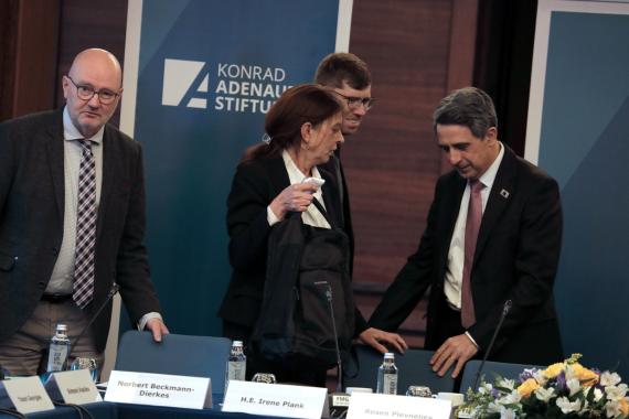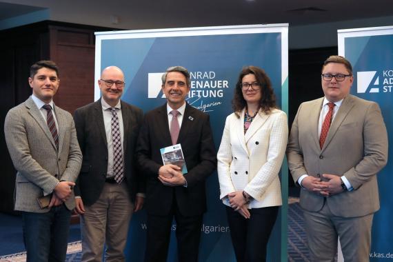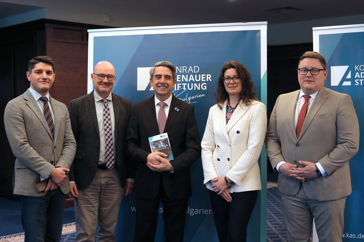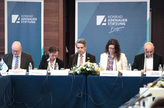 V.l.n.r. der Leiter der KAS Sofia Norbert Beckmann-Dierkes, die deutsche Botschafterin I.E. Irene Plank, der bulgarische Ex-Staatspräsident Rossen Plewneliew, die Moderatorin der Veranstaltung Slatosara Stoilowa und der Hauptgeschäftsführer der DBIHK Mitko Wassilew