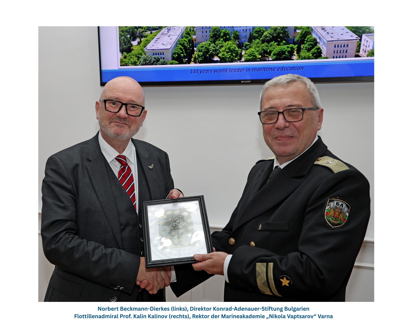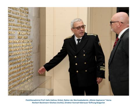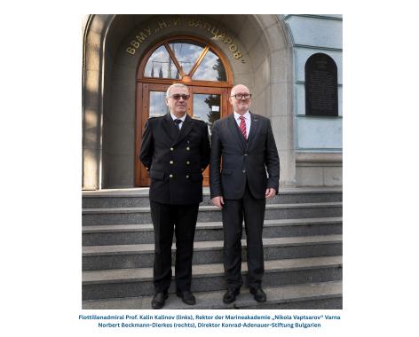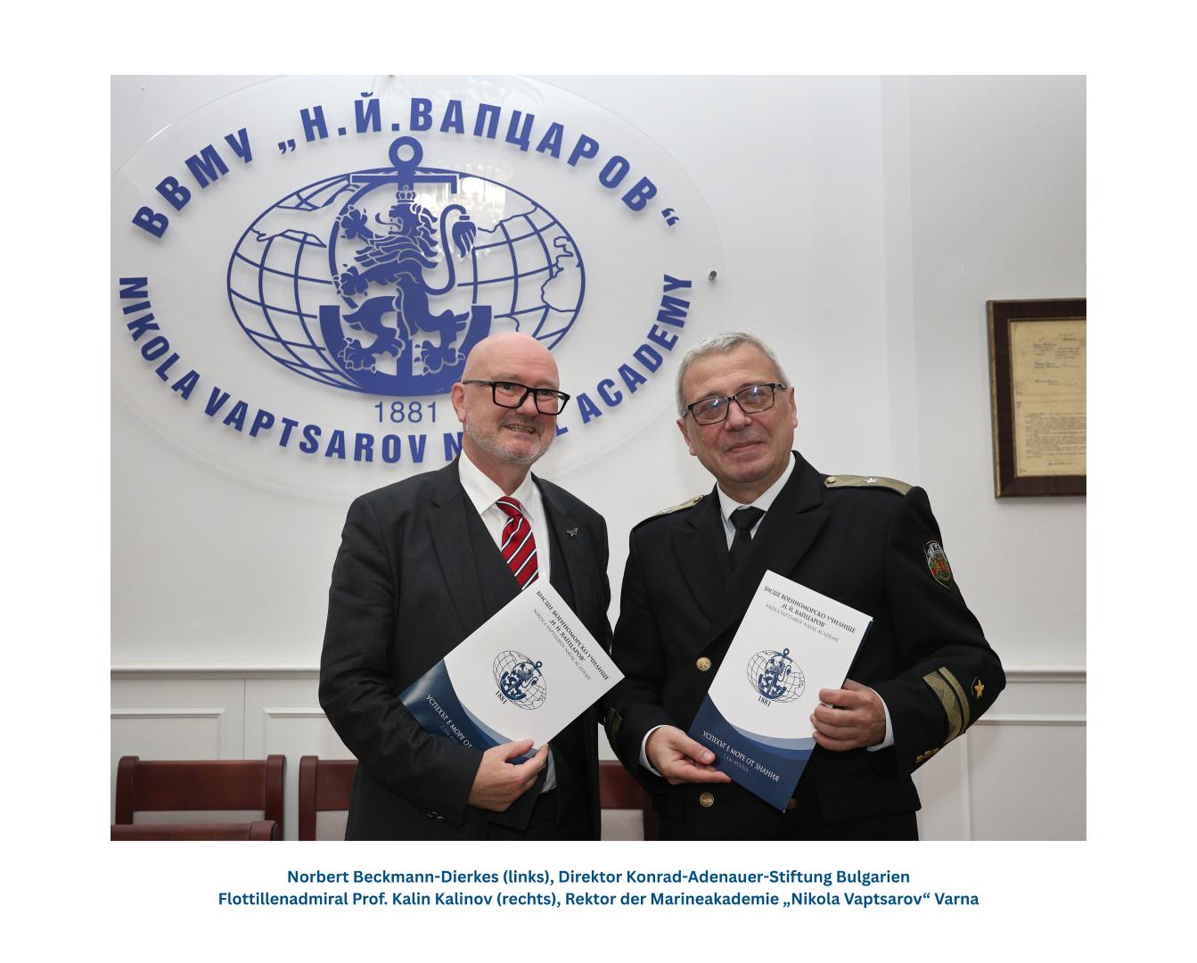 Am 20. November 2025 unterzeichneten der Leiter der KAS Bulgarien Norbert Beckmann-Dierkes und Flottenadmiral Prof. Kalin Kalinow, Rektor der Marineakademie Warna, ein Memorandum über Zusammenarbeit.