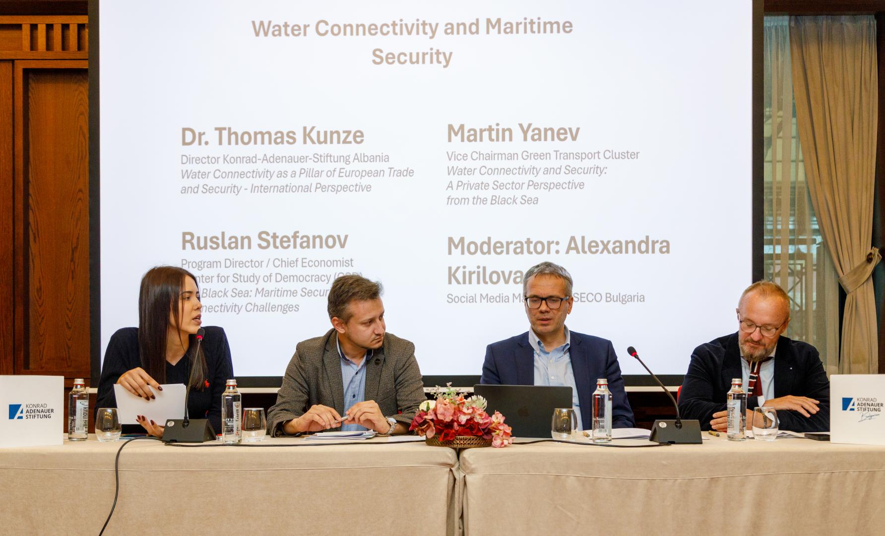 Die von der KAS in Auftrag gegebene Studie “Bulgaria`s Water Connectivity Challenges in the Light of Transport Routes and Water Scarcity” wurde am 20. Oktober 2025 bei großem Interesse seitens von Expertem Politikern und Diplomaten in Sofia im Beisein des Autors Yasen Georgiev vom Institut für Wirtschaftspolitik und des Leiters der KAS Albanien, Dr. Thomas Kunze, vorgestellt. Moderatorinnen der Veranstaltung waren Zlatozara Stoilova von der KAS und Alexandra Kirilova von RESECO.