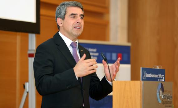 „Krisen beginnen immer da, wo Menschenrechte oder die Rechtsstaatlichkeit verletzt werden“ analysiert Plewneliew und meint einen Konflikt am Europas Grenze, der die geopolitische Entwicklung maßgeblich geändert habe: Seit der völkerrechtswidrigen Besetzung der Krim durch Russland befinde sich Moskau und der Westen in einem „Kalten Frieden“. „Kalt“ vor allem, „weil wir Konfrontationen und Methoden aus dem Kalten Krieg wiederhaben“: die Verschiebung nationaler Grenzen mit Gewalt, Großmachtstreben und Propaganda beispielsweise. Die Russische Föderation „erkältet“ Länder in ihrem vermeintlichen Einflussbereich, um sie durch eingefrorene Konflikte zu destabilisieren, kritisiert Plewneliew. Auf diese Weise wolle Moskau Staaten in seiner Peripherie abhängig machen, aber „Russland muss lernen, Partner zu haben, keine Vasallen.“ Dann könnten auch die Russen vom Wohlstand profitieren.
