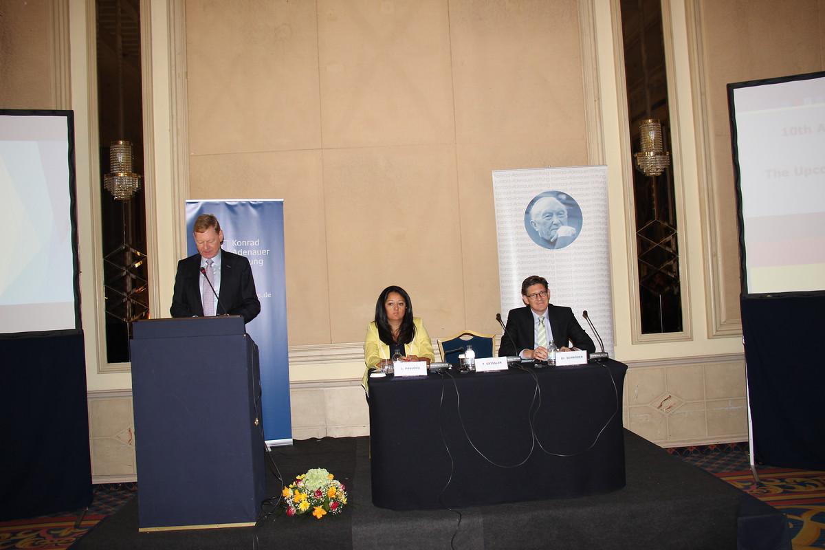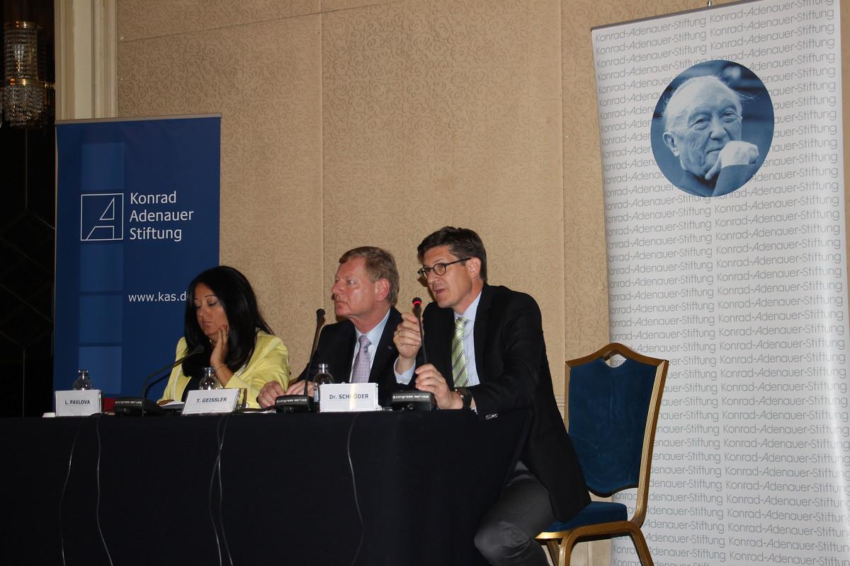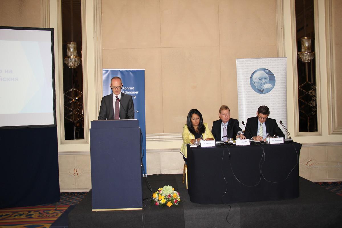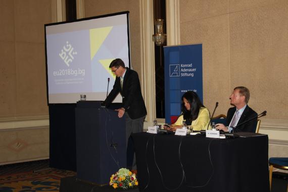 Die Veranstaltung wurde vom Leiter der KAS Sofia, Thorsten Geißler, eröffnet. In seinen einleitenden Worten stellte er die beiden Hauptthemen vor: der zehnte Jahrestag der bulgarischen EU-Mitgliedschaft und die Vorbereitungen auf den bulgarischen EU-Ratsvorsitz ab dem 1. Januar 2018.