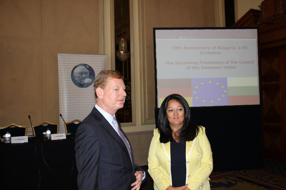 Am 11. September fand im Sheraton Hotel Balkan in Sofia anlässlich der zehnjährigen Mitgliedschaft Bulgariens in der Europäischen Union und der bevorstehenden bulgarischen EU-Ratspräsidentschaft eine Vortrags- und Diskussionsveranstaltung statt.Referenten waren die Ministerin für den bulgarischen EU-Ratsvorsitz, Liljana Pawlowa sowie Dr. Ole Schröder MdB, Parlamentarischer Staatsekretär beim Bundesminister des Innern. Der Geschäftsträger der Deutschen Botschaft in Sofia York Schuegraf sprach ein Grußwort.