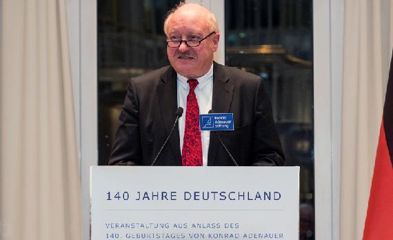 Der Vorsitzende der Stiftung, Dr. Hans-Gert Pöttering, begrüßte die Gäste und fügte einen leidenschaftlichen Appell an, das politische Erbe Konrad Adenauers vor allem in der Europapolitik fortzusetzen. Es zeigten sich manche Verwerfungen und Risse in der EU-Architektur, die der Vorsitzende nicht mit „weniger, sondern mit mehr Europa“ behoben wissen möchte. Er betonte die Legitimität der europäischen Institutionen und würdigte die Bemühungen der EU-Politik, Europa zu einem „besseren Teil der Erde“ zu machen.