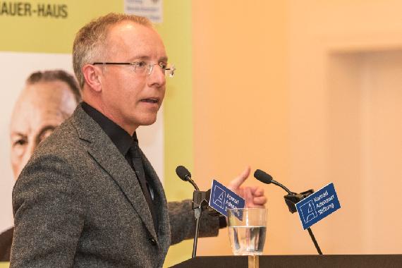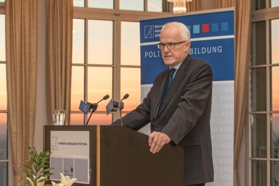 Prof. Dr. Karl-Rudolf Korte, Professor für Politikwissenschaft und Direktor der NRW School of Governance an der Universität Duisburg-Essen, fragte in seiner Rede, wie viel Adenauer heute noch in der CDU stecke und verglich die „Adenauer-Union“ mit der „Merkel-Union“. Dabei benannte er sieben Annäherungen zu den Gemeinsamkeiten zwischen den Parteivorsitzenden Konrad Adenauer und Angela Merkel.