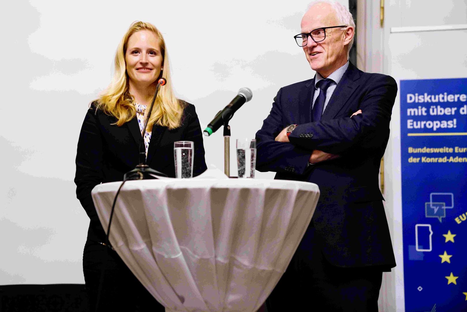 Jürgen Rüttgers, Bundesminister a.D. und Ministerpräsident a.D., griff diesen Gedanken auf. Für ihn sind die Wahlen zum Europäischen Parlament die wichtigsten in dieser Dekade. Sie entscheiden darüber, wie und ob es mit Europa weitergeht. Er fürchtet um die Zukunft der Demokratie und der Volksparteien als auch vor inneren und äußeren Angriffen. Deshalb forderte er alle auf, von ihrem Wahlrecht Gebrauch zu machen. Globalisierung, Digitalisierung und Frieden lassen sich nicht auf der nationalen Ebene lösen, dafür brauchen wir Europa. Schließlich schaffen wir es nur mit einer hohen Wahlbeteiligung die rechts- populistischen Tendenzen, die versuchen das gemeinsame Projekt der Europäischen Union zu untergraben, klein zu halten und verleihen dem Europäischen Parlament gleichzeitig die höchstmögliche demokratische Legitimität. Jürgen Rüttgers betonte vor allem die Erfolge auf die wir als Europäische Union in den letzten Jahrzehnten zurückblicken können. Die Europäische Union ist ein Friedensprojekt, das vielen zu mehr Wohlstand verholfen hat. Wir können auf eine stolze Industrie- und Innovationspolitik schauen, die neue Arbeitsplätze entstehen lässt. Zudem ist die Europäische Union zu einem bedeutenden Akteur auf der internationalen Bühne geworden. Sie setzt Standards und Normen, denen andere Staaten folgen. Gerade deshalb gilt es den European Way of Life zu verteidigen.