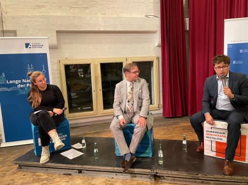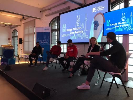 Die gesellschaftliche Sprach- und Debattenkultur stand im Mittelpunkt der Runden im Bürgerhaus Stollwerck. Ein übereinstimmendes Plädoyer für eine gepflegte Streitkultur und eine Absage an eine „cancel culture“, die gar die Wissenschafts- und Forschungsfreiheit einzuschränken versucht, eröffnete den Abend. Welche zunehmend negativen Auswirkungen im Internet zu beobachten sind, diskutierte die anschließende Runde. Hasskommentare, (fehlende) Unterstützung durch Behörden und der Wunsch nach mehr Aufklärungsarbeit an Schulen wurden anhand von praktischen Beispielen besprochen. In der dritten Diskussion des Abends wurden Ursachen für Extremismus und Auswege aus der Szene zwischen einem Politikwissenschaftler und einem Aussteiger diskutiert.