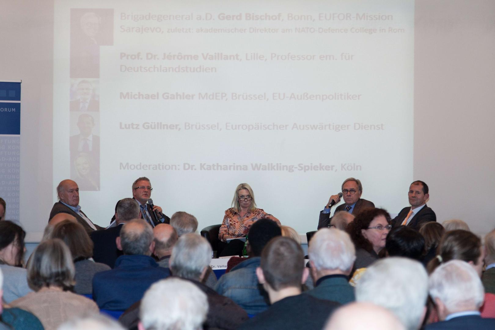 Am 22. November 2018 lud das Institut Francais in Kooperation mit dem Büro Bonn der Konrad-Adenauer-Stiftung und der Vertretung der EU-Kommission in Bonn zu einer Podiumsdiskussion über die Perspektiven einer handlungsfähigen Außen-und Sicherheitspolitik der EU ein. Geladen waren Michael Gahler, MdEP, und sicherheitspolitischer Sprecher der EVP-Fraktion, der Brigadegeneral a.D. Gerd Bischof, Leiter der EUFOR-Mission und zuletzt akademischer Direktor am NATO-Defence College in Rom, Lutz Güllner, Leiter des Referats Strategische Kommunikation im Europäischen auswärtigen Dienst und Prof. Dr. Jerome Vaillant, emeritierter Professor für Deutschlandstudien von der Universität Lille. Die Diskussion wurde von der freien Journalistin Dr. Katharina Walkling-Spieker moderiert.