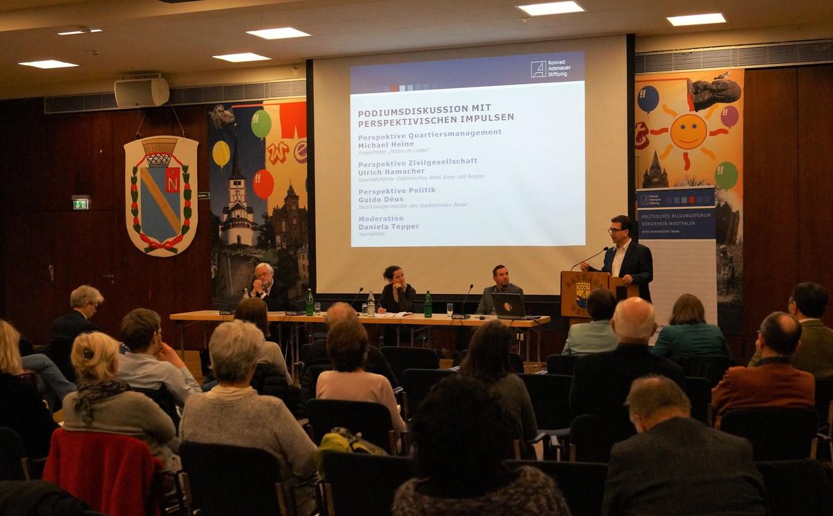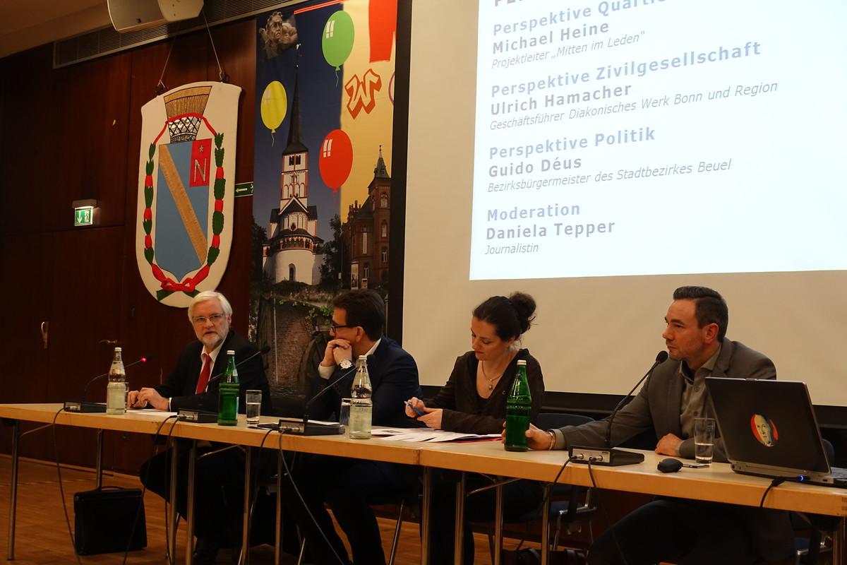 Der Beueler Bezirksbürgermeister Guido Déus benannte vor allem den zunehmenden Egoismus als ein großes Problem. Es sei mittlerweile leicht geworden, gegen etwas zu sein und gegen etwas zu mobilisieren. Für etwas zu sein und etwas gestalten zu wollen, sei hingegen deutlich schwerer geworden, was viele Menschen dann demotiviert. Dies stellt die Politik vor gewisse Schwierigkeiten, denn so finden oft nur die Protestierer Gehör. Er stellte aber auch fest, dass in Beuel die Welt doch noch etwas heiler sei als an vielen anderen Orten. Grund dafür ist aus seiner Sicht das Vereinsleben (in Beuel gibt es mehr als 200 aktive Vereine) und das Engagement in Kirchen. Denn Vereine und Kirchen sind ein sehr wichtiger Bestandteil des gesellschaftlichen Kitts. Allerdings sei es auch dort immer schwieriger Menschen für ein Ehrenamt zu motivieren.