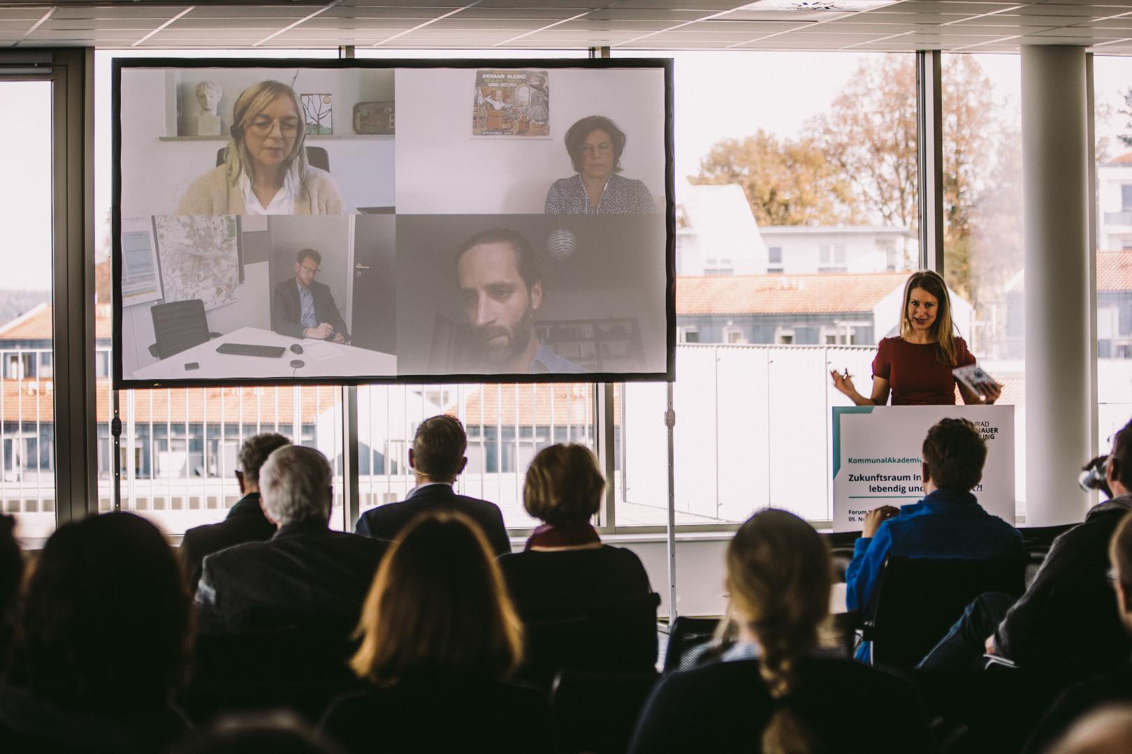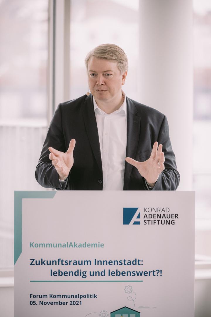 Schirmherr der Veranstaltung, Ministerpräsident Tobias Hans MdL, betonte in seiner Videobotschaft die Bedeutung der Innenstädte als "Symbolstätte von Heimat". Das Saarland fördere den Kurs der Eigenverantwortung und Stärkung der kommunal Verantwortlichen mit Hilfe des Saarpakts in Höhe von einer Milliarde Euro, damit Kommunen investieren könnten. Henrik Eitel, Chef der saarländischen Staatskanzlei und Bevollmächtigter des Saarlandes beim Bund, unterstrich in seinem Impuls die Vielfalt der Ansätze zur Belebung der Zentren; ein ganzer Instrumentenkasten sei nötig, da es nicht den einen Frequenzbringer gebe. Sankt Ingbert sei ein sehr gutes Beispiel für eine Kommune, die ihre Chance erkannt und das Glück am Schopfe gepackt habe. "Es braucht eben nicht nur Geld, sondern kommunales Engagement", so Eitel, der selbst als Kommunalpolitiker in seiner Heimatstadt aktiv ist. Oberbürgermeister Prof. Dr. Ulli Meyer bezeichnete Sankt Ingbert als heimliches Herz der IT-Wirtschaft im Saarland und hob hervor, dass Innenstädte das Gegenstück zur Blase im Internet seien. "In einer Stadt trifft man Menschen, die anders denken, die woanders herkommen und hinwollen." Die Stadt sei Ort der Begegnung. Jede Kommune müsse ihre Chancen erkennen und nutzen: Das könne die Natur sein, das könne das Thema Breitbandausbau sein (die Mischung aus Homeoffice und Pendeln berge insbesondere für Mittelstädte Chancen) oder auch das Themenfeld Studierende und Lehrende bzw. Ausgründungen von Hochschulen. Die Menschen seien entscheidend: "Eine Stadt ist so gut, wie die Menschen, die in ihr leben und sich zu ihr bekennen", resümierte der Oberbürgermeister von Sankt Ingbert.