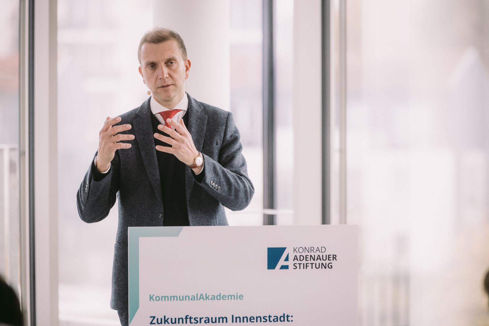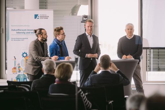 Dr. Christian Hübner, Dr. Georg Dufner und Nele Katharina Wissmann aus den KAS-Auslandsbüros in Hong Kong, La Paz und Paris berichteten über internationale Trends der Stadtentwicklung, wobei sie Effekte einer nachhaltigen urbanen Mobilität herausarbeiteten. Zum Abschluss der ersten Tageshälfte vertiefte ein Panel, u.a. besetzt mit Dr. Carsten Meier, Geschäftsführer IHK Saarland und Claus Köster, Jugendratsprecher der Stadt Ratingen, unterschiedliche Perspektiven der Gestaltung von Innenstädten.