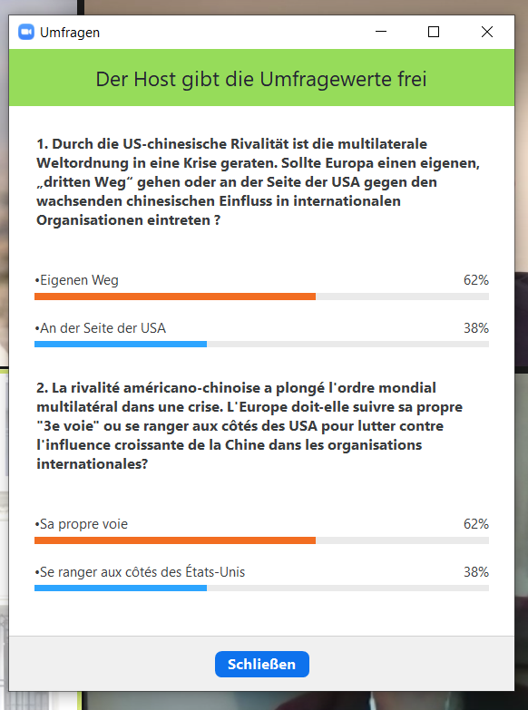 In der ersten Umfrage an das Publikum zeigte sich, dass unsere Zuschauer ebenfalls keine einheitliche Meinung darüber hatten, ob die EU zukünftig einen eigenen Weg gehen oder an der Seite der USA, gegen den wachsenden chinesischen Einfluss in internationalen Organisationen, stehen sollte. Eric-André Martin ließ hier die Frage einfließen, ob die EU überhaupt imstande sei, sich das auszusuchen. China habe schließlich einen starken Einfluss im europäischen Raum durch seine zahlreichen Investitionsprojekte. Europa müsse daher auch lernen, „Nein zu sagen“. Tara Varma schloss sich hier Eric-André Martin an. China tue als diktatorisches Regime alles um die eigenen Interessen international durchzusetzen, wodurch es erschwert wird mit China in einen Dialog zu treten. Außerdem definieren wir uns über unsere europäischen Werte, die denen der USA deutlich näher sind, als denen Chinas. Dennoch seien wir alle von China abhängig, da wir bei einigen globalen Fragen, wie z.B. zum Klima, auf die Zusammenarbeit Chinas angewiesen seien. Varma schlussfolgerte, dass die EU ihren eigenen Weg gehen müsse.