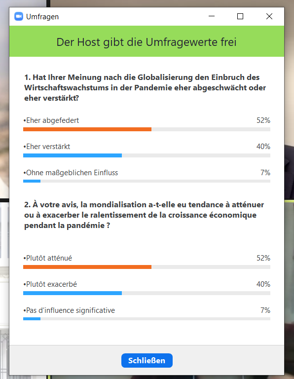 Auch die zweite Zuschauerfrage, ob die Globalisierung den Einbruch des Wirtschaftswachstums in der Pandemie eher abgeschwächt oder gestärkt habe, teilte das Publikum in zwei Lager.
