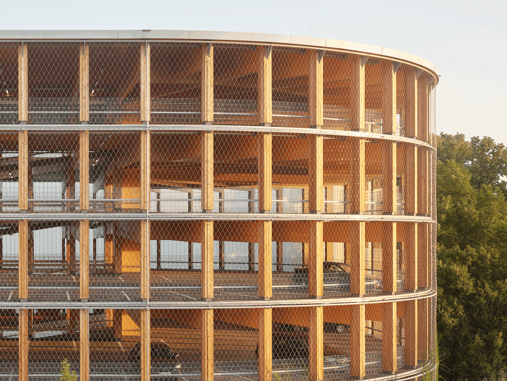 Zukunftsspaziergang #3 Holzparkhaus Wendlingen – rückbaubar, umnutzbar, zukunftsfähig: In direkter Nachbarschaft zu einem Bahnhof entsteht ein auffälliger ovaler Holzbau, der den Auftakt für das zukünftige, vielfältig genutzte Otto-Quartier bildet. Hier finden Pendlerinnen und Pendler sowie Besucherinnen und Besucher oberirdische, natürlich belichtete Stellplätze für Autos und Fahrräder. Mit einer Höhe von rund 18 Metern setzt das Parkhaus neue Maßstäbe in Sachen Nachhaltigkeit: Abgesehen von Treppenhäusern und Fahrbahnbelag besteht es vollständig aus Holz – einem Baustoff, der nicht nur CO₂ reduziert, sondern auch dauerhaft speichert. Die Konstruktion mit Schraubverbindungen und der bewusste Verzicht auf Verbundmaterialien ermöglichen einen sortenreinen Rückbau und die Wiederverwertung der eingesetzten Materialien. Gleichzeitig wurde bei der Planung an eine langfristige Nutzung gedacht: Die großzügige Geschosshöhe erlaubt eine spätere Umnutzung zu Wohn- oder Arbeitsräumen. Die zentrale Rampe kann etappenweise entfernt und durch einen lichtdurchfluteten Innenhof ersetzt werden.