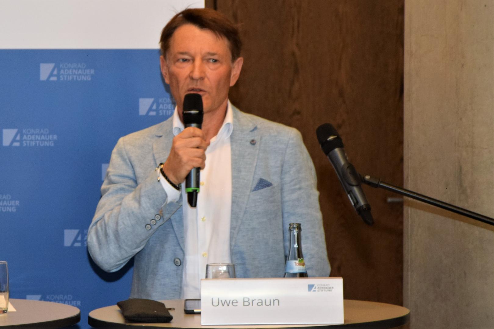 Moderiert wurde der Abend von SZBZ-Chefredakteur Jürgen Haar, der humorvoll und dennoch auf gleichmäßige Redezeiten bedacht seine Panelgäste löcherte; drei Vertreter wichtiger Institutionen, deren Funktionen unterschiedlicher kaum sein konnten: Oberkirchenrat Dr. Martin Kastrup, der Böblinger CDU-Bundestagsabgeordnete Marc Biadacz und Uwe Braun, Personalleiter von Daimler für den Standort Sindelfingen.