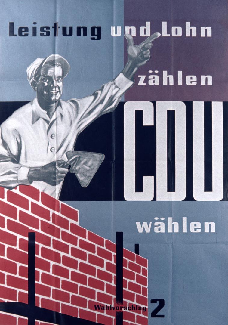 In der Ära Adenauer mit Wirtschaftsminister Ludwig Erhard, der als Galionsfigur für die leistungsorientierte Ordnungspolitik stand, war der Leistungsbegriff implizit ein Fundament der CDU-Programmatik. Die Erfolge des „Wirtschaftswunders“, die ein Wachstum von bis zu zehn Prozent des Bruttoinlandsprodukts und ständig steigende Staatseinnahmen bedeuteten, stellten einen zunehmenden Verteilungsspielraum sicher. Erfolgreich konzentrierten sich die Strategen der Unionswahlkämpfe darauf, die positive Wirtschaftsentwicklung mit konkreten Personen zu verbinden. Während Konrad Adenauer als Garant für Sicherheit, Stabilität und die Westbindung präsentiert wurde („Keine Experimente!“ titelte das zentrale Plakat zum Bundestagswahlkampf 1957), wurde der wirtschaftliche Erfolg mit Ludwig Erhard verknüpft. Diese Verbindung von erfolgreicher Wirtschaftspolitik und Amtsbonus erwies sich als unschlagbar.