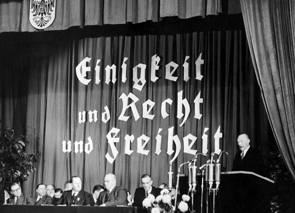 Das schwang deutlich im Eröffnungsreferat Adenauers vor den 385 Delegierten und 600 Gästen, nicht zuletzt auch christliche Demokraten aus den Nachbarländern, mit dem programmatischen Titel „Deutschlands Stellung und Aufgabe in der Welt“ mit: Es sei der einzige Weg, den Frieden zu sichern, den Westen stark zu machen, und es werde keinen Krieg geben, „wenn Sowjet-Rußland eine Macht gegenübergestellt wird, die ihm gewachsen ist“. Das christliche Gedankengut der CDU sei eine große Hilfe beim Kampf gegen den „Bolschewismus“. Es werde sich entscheiden, so Adenauer in zeittypischer Pathetik, „ob Freiheit, Menschenwürde, christlich-abendländisches Denken der Menschheit erhalten bleibt oder ob der Geist der Finsternis und der Sklaverei, ob der anti-christliche Geist für eine lange Zeit seine Geißel über die hilflos am Boden liegende Menschheit schwingen wird“.