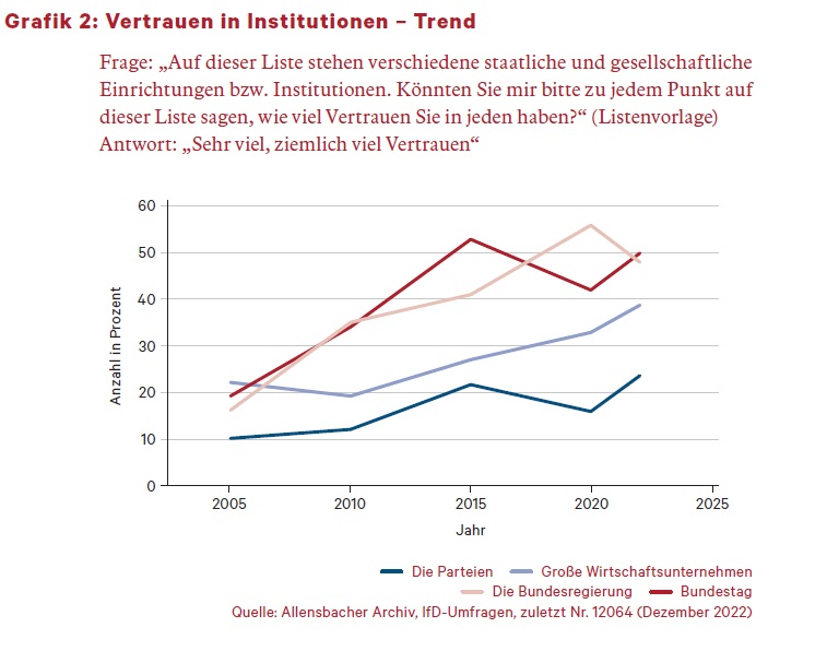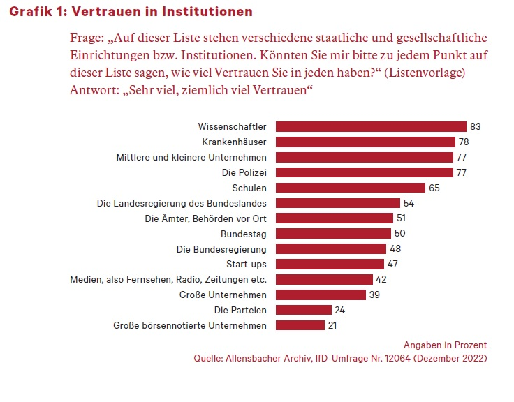 Vor diesem Hintergrund ist die Tatsache von Bedeutung, dass das Ansehen der wichtigsten staatlichen Institutionen in Deutschland in den letzten zwei Jahrzehnten nicht etwa, wie oft behauptet wird, gesunken, sondern umgekehrt gestiegen ist. Dies zeigen die Antworten auf die vom Institut für Demoskopie Allensbach im Dezember 2022 gestellte Frage, zu welchen staatlichen oder gesellschaftlichen Institutionen und Einrichtungen man Vertrauen habe. Die Befragten erhielten eine Liste mit vierzehn Punkten zur Auswahl und wurden gebeten, zu jeder Institution auf der Liste anzugeben, ob sie ihr gegenüber sehr viel, ziemlich viel, wenig oder überhaupt kein Vertrauen haben. In Grafik 1 sind die Anteile derjenigen zusammengefasst, die sagten, sie hätten zu der betreffenden Institution sehr viel oder ziemlich viel Vertrauen. An erster Stelle in der Rangliste, genannt von 83 Prozent, standen die Wissenschaftler. Es folgten knapp dahinter Krankenhäuser, mittlere und kleinere Unternehmen, die Polizei und, mit etwas Abstand, die Schulen. Mit deutlichem Abstand, genannt jeweils von etwa der Hälfte der Bevölkerung, rangierten die wichtigsten Institutionen des Staates im Mittelfeld: die Landesregierungen, der Bundestag und die Bundesregierung. Dagegen sagte nur knapp jeder vierte Befragte, er habe sehr viel oder ziemlich viel Vertrauen in die Parteien.
