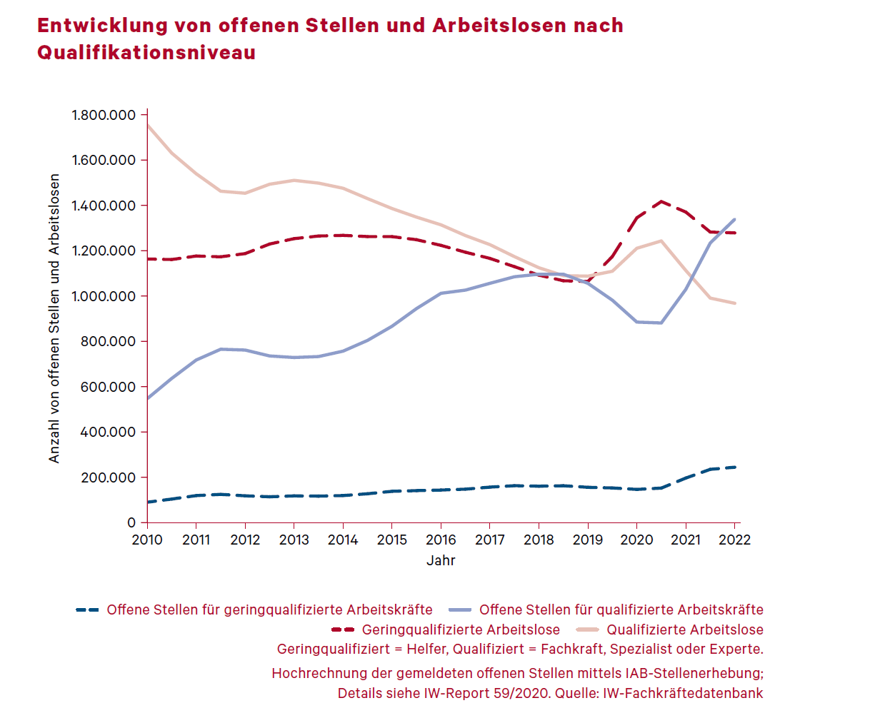 Angebot und Nachfrage fallen oftmals räumlich auseinander und setzen eine hohe Mobilitätsbereitschaft voraus. Zudem kann eine Softwareentwicklerin nicht als Bauingenieurin arbeiten oder ein Erzieher als Pflegefachkraft. Gleicht man die Qualifikationen, die in den offenen Stellen gefragt sind, mit denen der Arbeitslosen auf Ebene der 1.300 Berufsgattungen ab, was die IW-Fachkräftedatenbank ermöglicht, fehlten sogar 630.000 qualifizierte Arbeitskräfte. 2022 erreichte die Fachkräftelücke für qualifizierte Fachkräfte damit ein neues Rekordhoch.