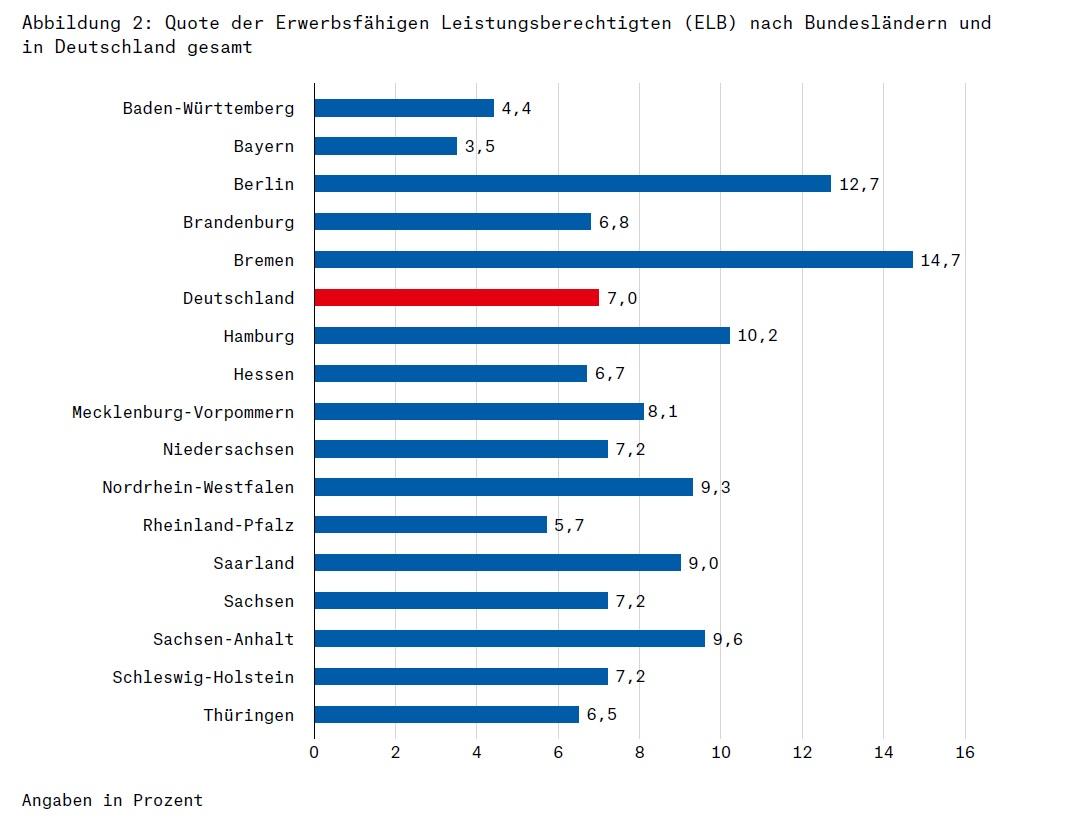Unter den Regelleistungsberechtigten im SGB-II-Bezug waren nach Angaben der Statistik der Bundesagentur für Arbeit im Dezember 2022 rund 1,6 Millionen Ausländerinnen und Ausländer (42,1 Prozent). Frauen waren etwas häufiger auf entsprechende Leistungen angewiesen als Männer (51,8 Prozent gegenüber 48,2 Prozent). Die Mehrheit der erwerbsfähigen Leistungsberechtigten war zwischen 25 bis unter 55 Jahre alt (63,0 Prozent). Außerdem variieren die Bezugsquoten regional deutlich (siehe Abbildung 2). Insbesondere in den Stadtstaaten und in den ostdeutschen Bundesländern waren viele Menschen auf Leistungen aus dem SGB II angewiesen.