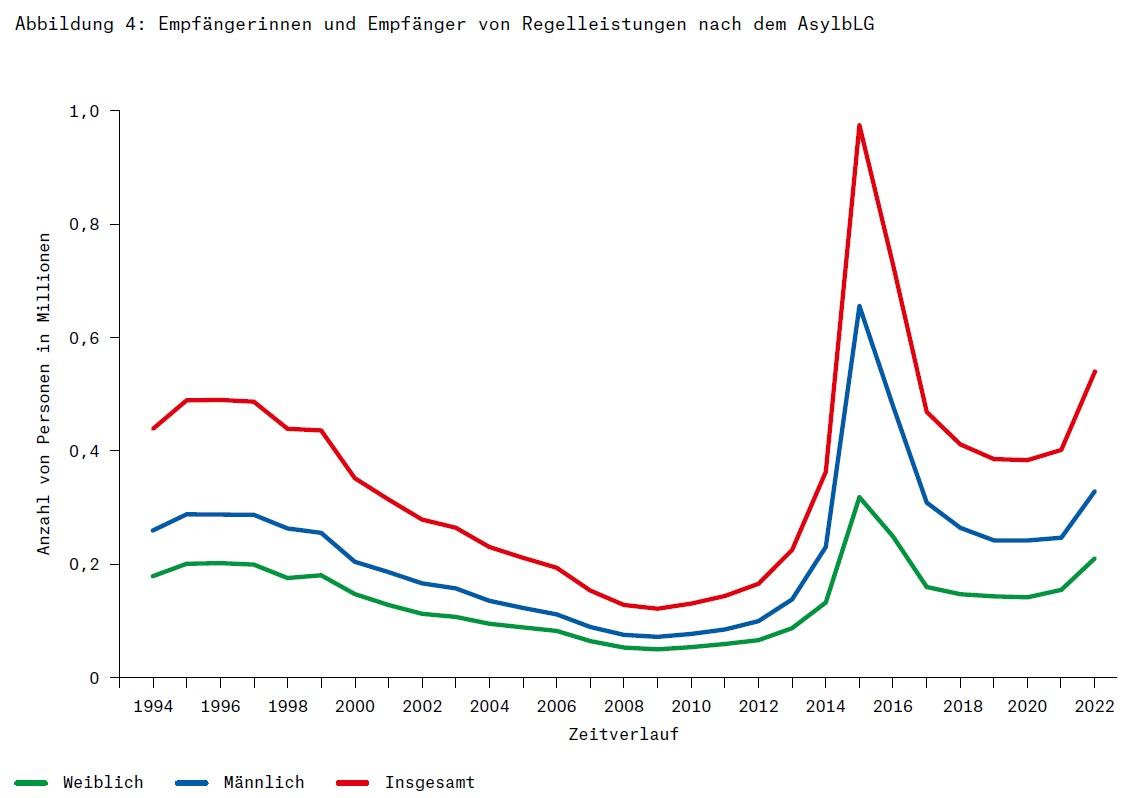 Quelle: Statistisches Bundesamt: Statistik Empfänger von Regelleistungen nach dem Asylbewerberleistungsgesetz: Deutschland, Stichtag (bis 31.12.), Geschlecht; Statistik 22221-0001. Eigene Darstellung.
