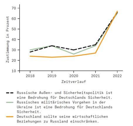 Parallel dazu ist die Bereitschaft, die wirtschaftlichen Beziehungen zu Russland einzuschränken, massiv gestiegen (67 Prozent; +40 Prozentpunkte). Das ehemals ambivalente Russlandbild ist der Erkenntnis gewichen, dass Russland eine Bedrohung für unsere Sicherheit darstellt.