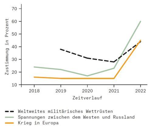 Eine Mehrheit von 60 Prozent fühlt sich durch die Spannungen zwischen dem Westen und Russland bedroht (+37 Prozentpunkte). Und auch die Sorge vor einem weltweiten militärischen Wettrüsten hat mit dem Krieg in der Ukraine deutlich zugenommen (44 Prozent; +16 Prozentpunkte im Vergleich zu 2021). Es zeichnet sich hier eine Zeitenwende in der Bedrohungswahrnehmung ab, denn in den Vorjahren spielten diese sicherheitspolitischen Risikofaktoren lediglich eine nachgeordnete Rolle für das persönliche Sicherheitsgefühl; jetzt beeinträchtigen sie es sehr stark.