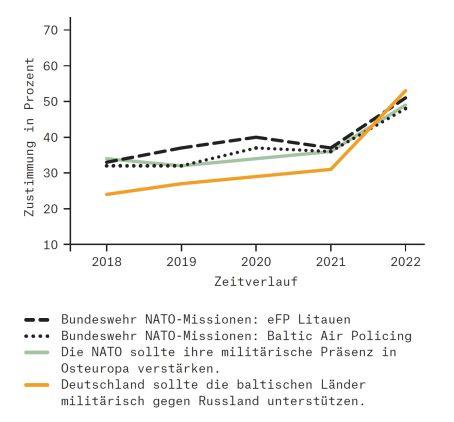 So plädiert inzwischen eine absolute Mehrheit (53 Prozent; +22 Prozentpunkte im Vergleich zu 2021) dafür, dass Deutschland die baltischen Staaten militärisch unterstützen sollte, damit sich diese gegen Russland wehren können, 16 Prozent lehnen dies ab, und 27 Prozent haben eine ambivalente Haltung. Zudem sprechen sich 49 Prozent (+13 Prozentpunkte) dafür aus, dass die NATO ihre Präsenz in Osteuropa verstärken sollte, 22 Prozent lehnen dies ab, und 24 Prozent sind unentschieden. Auch die Missionen der Bundeswehr an der NATO-Ostflanke werden mehrheitlich unterstützt (Enhanced Forward Presence Litauen: 51 Prozent; +14 Prozentpunkte; Baltic Air Policing: 48 Prozent; +12 Prozentpunkte).