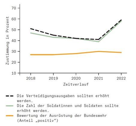 Nach Auffassung von Bundeskanzler Olaf Scholz spiegelt der eingeleitete verteidigungspolitische Kurswechsel „ein neues Bewusstsein auch in der deutschen Gesellschaft wider. Heute ist eine große Mehrheit der Deutschen der Ansicht, dass unser Land eine Armee mit der Fähigkeit und der Bereitschaft braucht, Gegner abzuschrecken und sich sowie seine Verbündeten zu verteidigen“ (Scholz 2022). Gibt es eine solche „Zeitenwende in den Köpfen“ tatsächlich? Repräsentative Bevölkerungsbefragungen können hierauf eine Antwort geben. Die größte Umfragestudie und längste Zeitreihe zu verteidigungspolitischen Einstellungen in Deutschland ist die seit 1996 jährlich im Auftrag des Bundesministeriums der Verteidigung durchgeführte Bevölkerungsbefragung des Zentrums für Militärgeschichte und Sozialwissenschaften der Bundeswehr (ZMSBw).