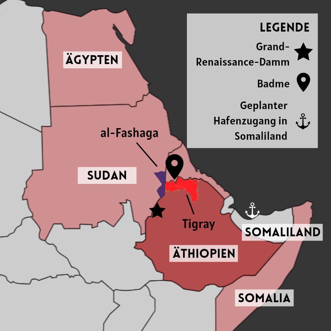 Der Streit um den Großen Renaissance-Staudamm ist nicht der einzige Zwist, der die Beziehungen zwischen Äthiopien und dem Sudan vergiftet. Ein weiterer Konfliktherd ist die Grenzregion Al-Fashaga. Al-Fashaga ist eine fruchtbare Grenzregion zwischen beiden Ländern, die seit Jahrzehnten von äthiopischen Bauern genutzt wird. Der Sudan beansprucht das Territorium; Äthiopien hatte seine Ansprüche 2008 aufgegeben, operierte jedoch militärisch weiter in dem Gebiet. Als die Streitkräfte Abiy Ahmeds im Tigray-Krieg gebündelt waren, nutzte der Sudan – drei Jahre vor Beginn seines eigenen Bürgerkriegs – die Gelegenheit und besetzte die gesamte Region. Es kursierten Meldungen über einen Rückeroberungsversuch Addis Abebas, der jedoch nie bestätigt und von Ahmed dementiert wurde. Neben dem Streit um Wasserrechte reihte sich nun ein ungelöster Grenzkonflikt in die Differenzen zwischen Äthiopien und seinen nördlichen Nachbarn ein.