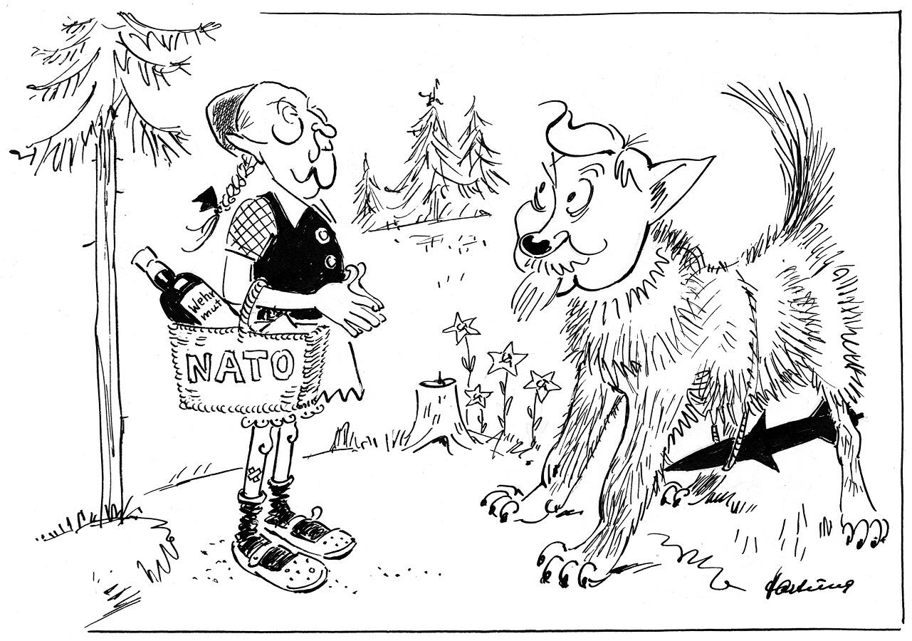 Als Wilhelm Hartung seine Zeichnung anfertigte, lagen die diesbezüglichen Briefe Bulganins bereits öffentlich vor und waren in aller Munde. Seine eigene Position brachte Hartung mit dem Motiv des nuklearen Wolfs im bürgerlichen Schafspelz auf den Punkt. Ebenso klar deutete er die Reaktion des Bundeskanzlers: Das Rotkäppchen verhält sich abweisend und klammert seinen Korb mit NATO-„Wehrmut“ fest unter dem Arm. Bei aller Flexibilität, ja Verschlagenheit, die Hartung ihm in seinen Zeichnungen attestierte, blieb Adenauer, was seine politischen Grundsatzentscheidungen betraf, unerschütterlich.