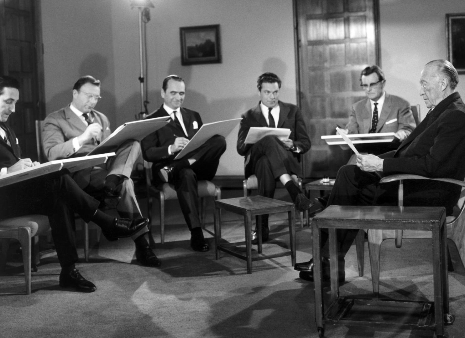 Porträtsitzung des scheidenden Bundeskanzlers Konrad Adenauer mit fünf Karikaturisten namhafter Zeitungen, Palais Schaumburg, Bonn, 2. Oktober 1963