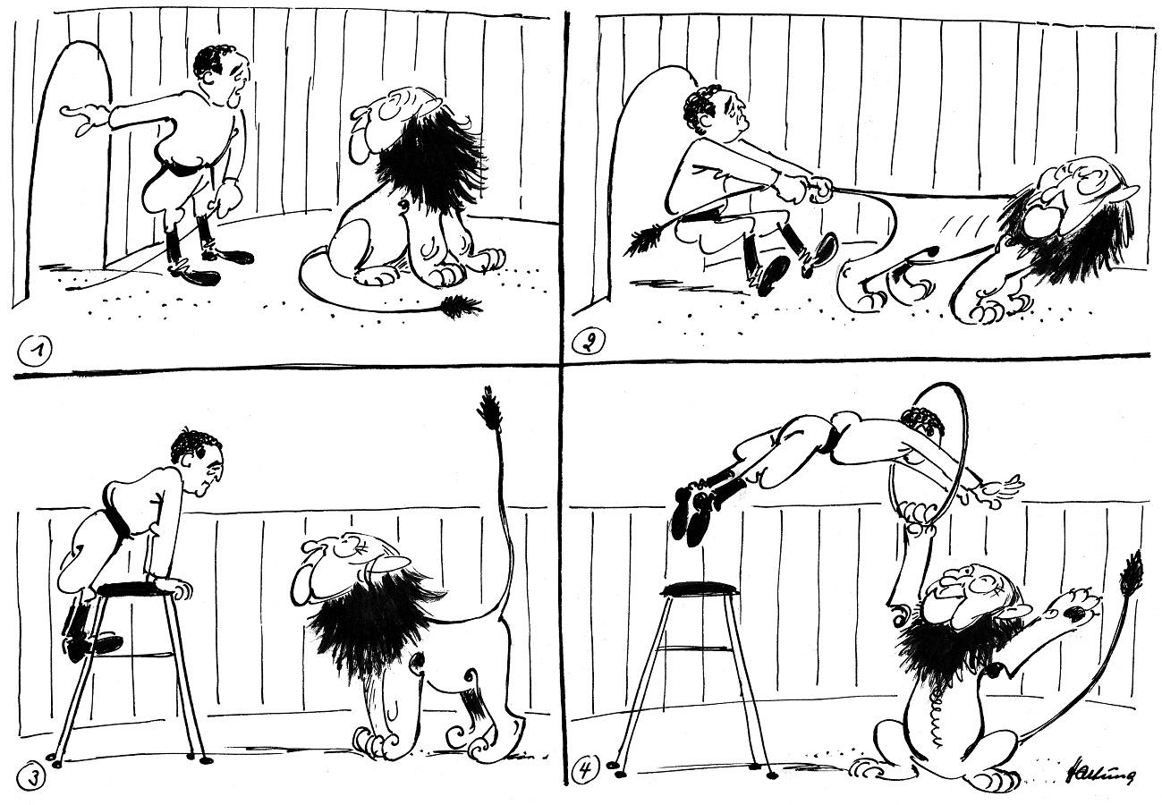Am Ziel war ebenfalls FDP-Chef Erich Mende, der seine Partei aus der Opposition zurück in die Regierung geführt hatte. Wegen der Verlängerung von Adenauers Kanzlerschaft musste er freilich einen beträchtlichen Prestigeverlust hinnehmen, der sich im Spott des Karikaturisten niederschlug. Der alerte Mende, in Bonn als „schöner Erich“ bekannt, wirkt in den Karikaturen recht hilflos und beinahe schon ein wenig mitleiderregend. Am 27. September 1961 porträtierte ihn Hartung als trotzigen „Suppenkasper“ (S. 193), der sich weigerte, die Adenauer-Suppe auszulöffeln (heute wissen wir, dass der FDP-Vorsitzende zu diesem Zeitpunkt schon auf eine Übergangslösung eingeschwenkt war und den Kurswechsel taktisch vorbereitete). Daraufhin begibt sich der „kluge Dompteur“ in die Zirkusmanege, um Adenauer, den „widerspenstigen Löwen“, aus der Arena zu vertreiben (S. 184). Nachdem alles Bitten und Zerren nichts genutzt hat, steigt er selbst auf den Schemel und springt durch den Reifen, den das grinsende Raubtier ihm vorhält. Das Storytelling dieser großartigen Karikatur ist derart komplex, dass Hartung hier von der üblichen Ein-Bild-Darstellung abwich und die Handlung auf vier Motive verteilte.