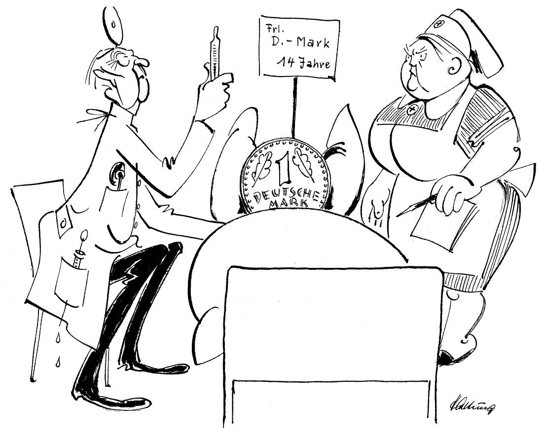 Sechs Jahre später hatten sich die Machtverhältnisse endgültig verschoben, wie die Debatte über die „D-Mark-Konferenz“ vom 16. Juli 1962 zeigte. In Reaktion auf anhaltende Preissteigerungen berief Adenauer an diesem Tag ein Treffen von Spitzenvertretern aus Industrie, Handel und Bankenwelt ein, um über stabilitätspolitische Maßnahmen zu beraten – sehr zum Ärger Erhards, der die Berichterstattung hierüber für kontraproduktiv hielt und stattdessen auf Tarif- bzw. Haushaltsdisziplin pochte, um die Hochkonjunkturprobleme in den Griff zu bekommen. In der diesbezüglichen Hartung-Karikatur sitzt der Kanzler als Arzt am Krankenbett von „Frl. D-Mark“, dabei so kritisch beäugt von der robusten Schwester Erhard, dass Zweifel angebracht sind, ob sein Befund („Temperatur erhöht – Puls matt“) in eine medizinische Behandlung münden wird (S. 231). Tatsächlich fand Adenauer mit seinen Inflationssorgen kaum Gehör, und das Stabilitätsprogramm, das schließlich im Oktober verabschiedet wurde, trug stark die Handschrift des Wirtschaftsministeriums.