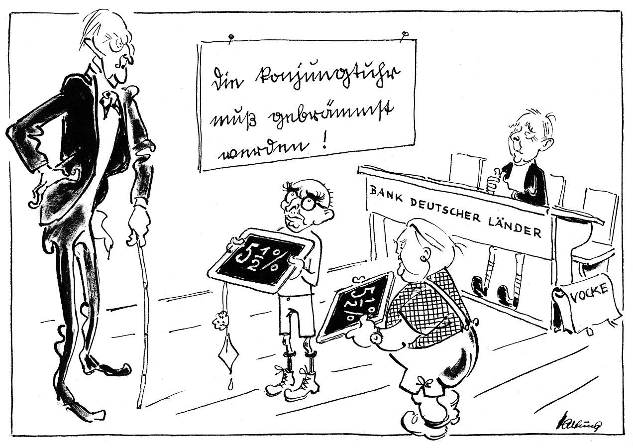 Zweifelsohne war Erhard das „beste Pferd“ im Kabinettsstall, wie Hartung es in einer Karikatur vom 25. September 1957 zum Ausdruck brachte (S. 107). Ross und Reiter verband aber ein komplexes Verhältnis voller Höhen und Tiefen, das immer schwieriger wurde, je unklarer es schien, wer hier eigentlich wem die Zügel lenkte. Als sie sich im Mai 1956 auf offener Bühne über die Geldpolitik zerstritten, ließ Hartung Adenauer als gestrengen Lehrer mit seinen Pennälern (neben Erhard auch Finanzminister Fritz Schäffer) schimpfen, weil sie den Prozentsatz der Diskonterhöhung von Notenbankpräsident Wilhelm Vocke abgeschrieben hätten, der ebenfalls im Klassenzimmer saß (S. 226). Treffend erfasst ist damit der Unmut des Kanzlers über die Unabhängigkeit der Bank deutscher Länder bzw. der Bundesbank, die er gerne anders geregelt gesehen hätte. Gleichwohl agierte Erhard in der Leitzinsdebatte keineswegs als verlängerter Arm Vockes, sondern entwickelte seine konjunkturpolitischen Maßnahmen eigenständig und – zum besonderen Missfallen Adenauers – ohne Abstimmung mit dem Kanzleramt.