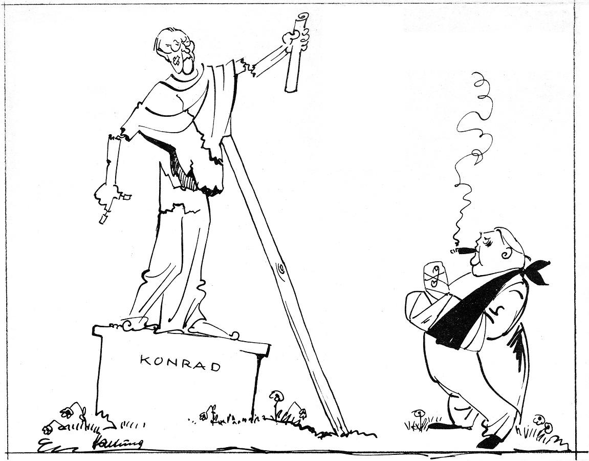 Vermutlich war diese Affinität nicht nur persönlich begründet, sondern mindestens ebenso sehr professioneller Art. Adenauers Prominenz in den Karikaturen konnte, unabhängig von ihrer inhaltlichen Aussage, als Gradmesser seiner öffentlichen Reputation gedeutet werden. Auch hat man in der Bundesregierung rasch erkannt, dass sie sich hervorragend als Werbemittel und Instrument der politischen PR eigneten. In enger Abstimmung mit der Familie Adenauer und dem Bundespresseamt erschien 1955 die Karikaturen-Anthologie „Konrad, sprach die Frau Mama“, die – zusammen mit einem Folgeband von 1963 – das visuelle Adenauer-Gedächtnis bis heute prägt. Adenauer und die Karikaturisten, so scheint es, verband eine symbiotische Beziehung, und es ist verständlich, dass Zeichner aller politischer Couleur seinen Rücktritt nach vierzehnjähriger Kanzlerschaft sehr bedauerten.